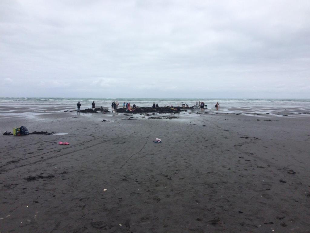 Merry Christmas to all from NZ. It was an odd Christmas in that there was no 4am wake up from the kids for presents. We have done that, a week ago so they are happy doing their things this year. The Drummer is with her BF and The Piper is with his Dad. Meantime we headed to Aotera for a walk while we waited for the tide to drop. In researching our trip we discovered that Kawhai has its own hot water beach so we decided to have a hot water spa for Christmas. The Newby promised to dig me one as my present but there are a few limitations. Firstly the tide needs to be low, then you need a shovel, then you need to like black sand everywhere and finally you need to traverse the sand dune. But believe me it’s all worth it. Within a few minutes I was sitting in our kidney shaped pool across the geothermal seam, enjoying the warmth from the water on a cool and overcast Christmas Day. We had the heads up about how to find the seam from the friendly caravan park owner. You have to walk down the beach, lining up the two yellow poles, digging your feet into the sand, until you find the spot. And we found it.