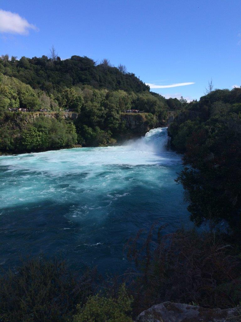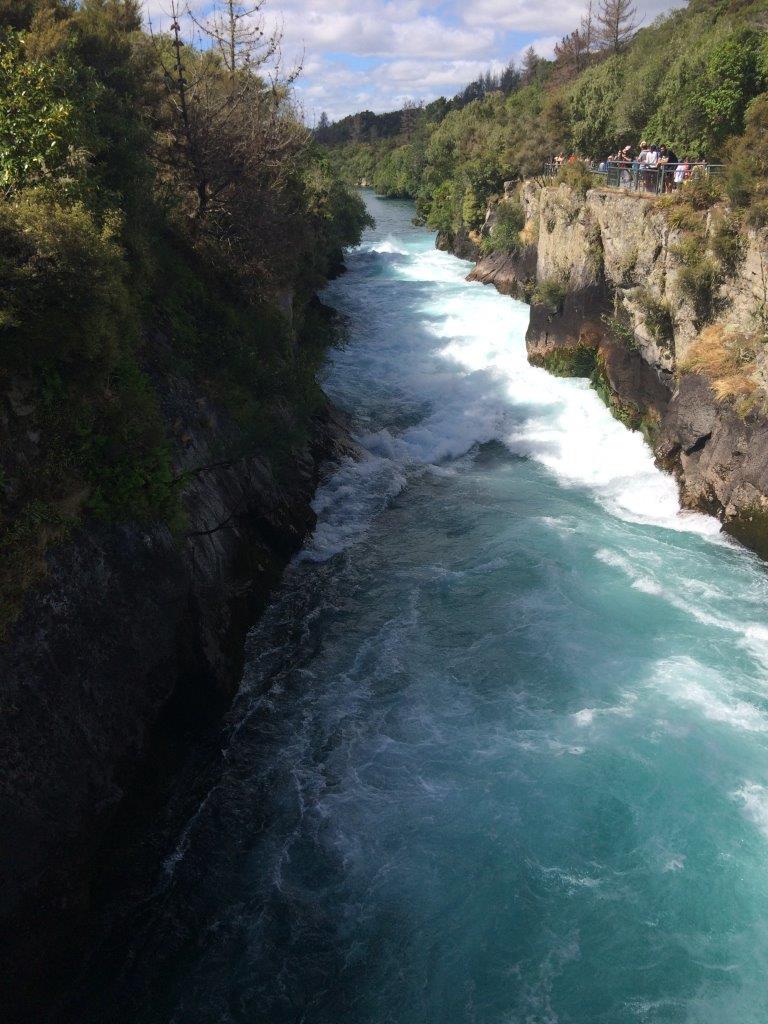 Safely back on land we decided to have a quick look at the renowned Huka falls. These falls are NZ’s most visited attraction simply because they are accessible. The carpark attests to how popular they are but going late in the day proved to be a smart move. The stats are amazing and are a consequence of the Waikato River being the only draining river out of Lake Taupo. Consider this. Lake Taupo is a volcano caldera the geographical size of Singapore and drains via one river. When that river narrows from 100m to just 15 meters across the edge of the caldera, despite only falling 11m, the falls are spectacular. This is because approximately 220,000 liters per second goes over the edge. That’s not a typo but it is enough to fill one Olympic sized swimming pool in 11 seconds! If you’re up for it, you can experience the falls in a jetboat but the thought of doing this activity at the most visited sight in NZ killed the excitement a bit for me. I like the sights as much as the next person but I’m not that keen on my fellow travelers. No offense intended.