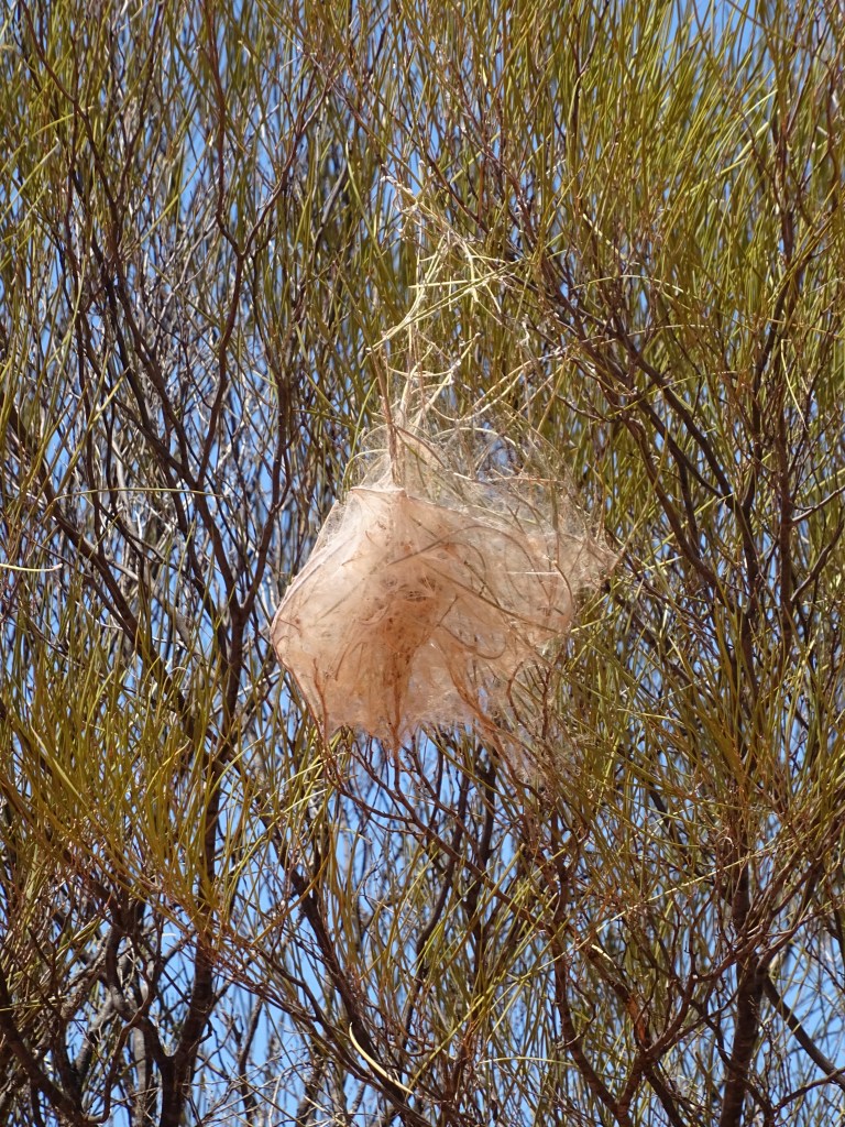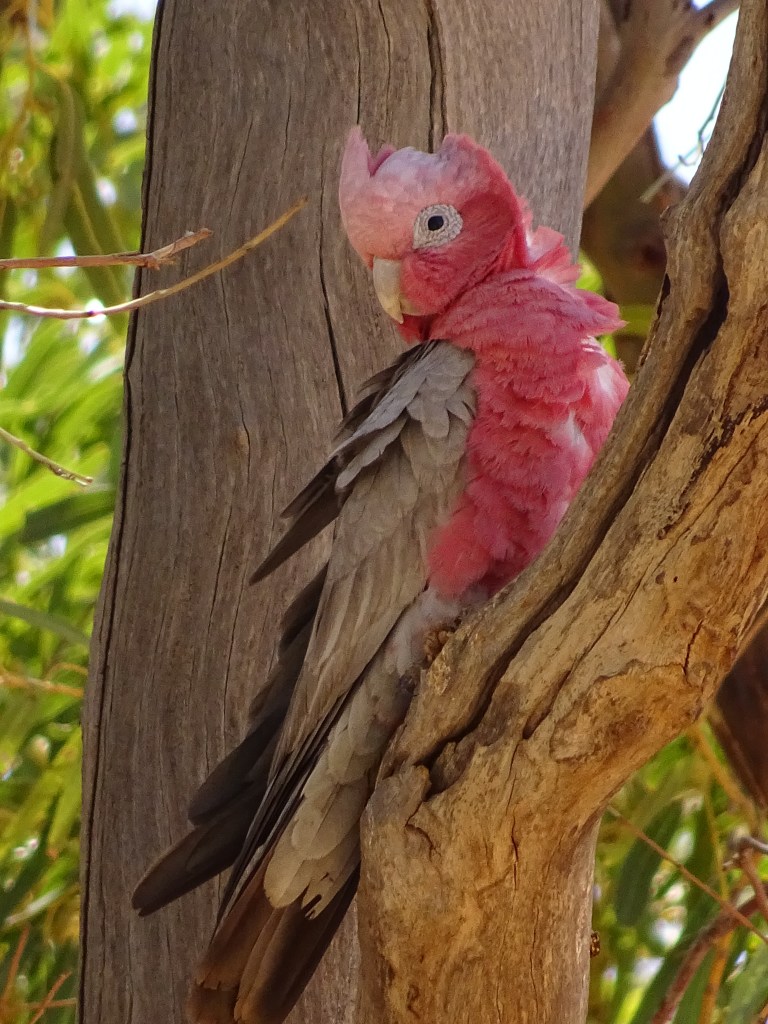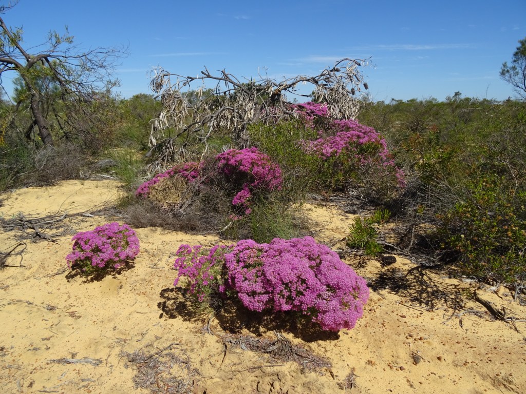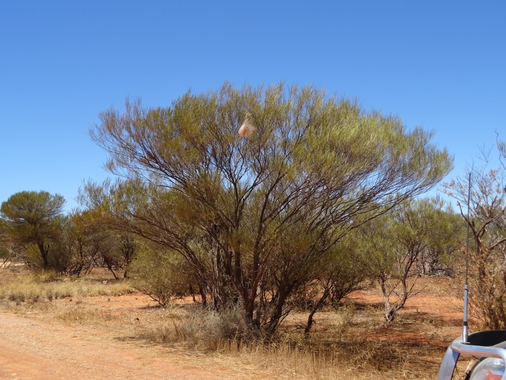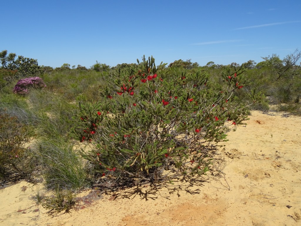 Fortunately we woke up right where we fell asleep, with hundreds of corellas screeching around. Check out this bit of video. Our drive today was a lot easier than yesterday, along roads lined with yellow grevillas and flowering banksia, some of which were suffering from gall infestation. We also admired a beautiful hot pick shrub and a stunning red plant. The WA Christmas bush has finished flowering while we have been away, at least around these parts.