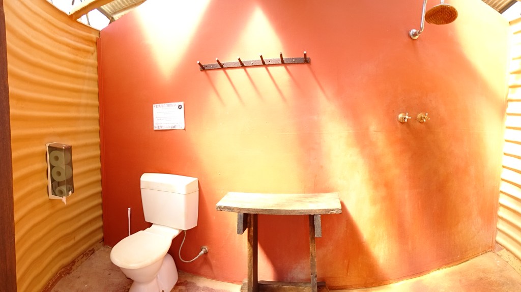 Now that was a much better sleep. Gosh it’s nice here. We had some lovely toast under the awning, facing the river, as if it’s flowing full of water, with dolphins expected to appear at any moment. Our morning toilet was taken in the awesome ensuite bathrooms just across the road. There are two bathrooms inside a roofless water tank. Lucky it’s roofless – I forgot my towel so Mr Bolo had to throw his over the beams to me for a lend.