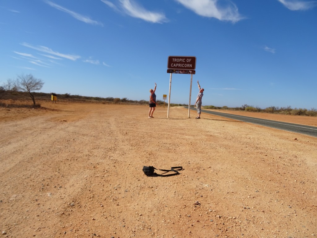 We had to leave Wooramel this morning so we could travel a bit further north. It took us a little while to get the camper on the tray correctly because Mr Orange Legs’ directions were slightly off. Eventually we got it sorted and started driving, first to Carnarvon for lunch and then to Coral Bay. On the way we crossed the Tropic of Capricorn. Do you know what that is? I have been across it lots of times, in different parts of Australia. We have also crossed the Tropic of Cancer. In fact we have crossed both of them this year. We crossed Cancer while we were on the cruise in January and now Capricorn in November.