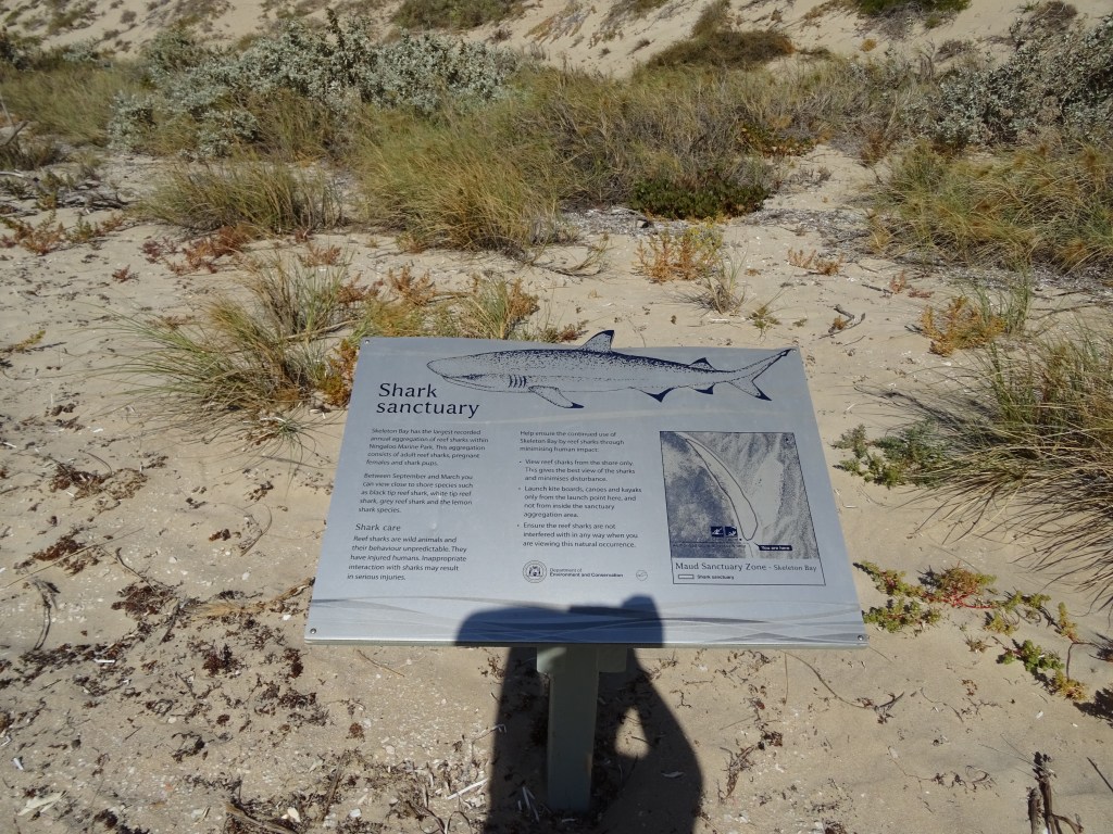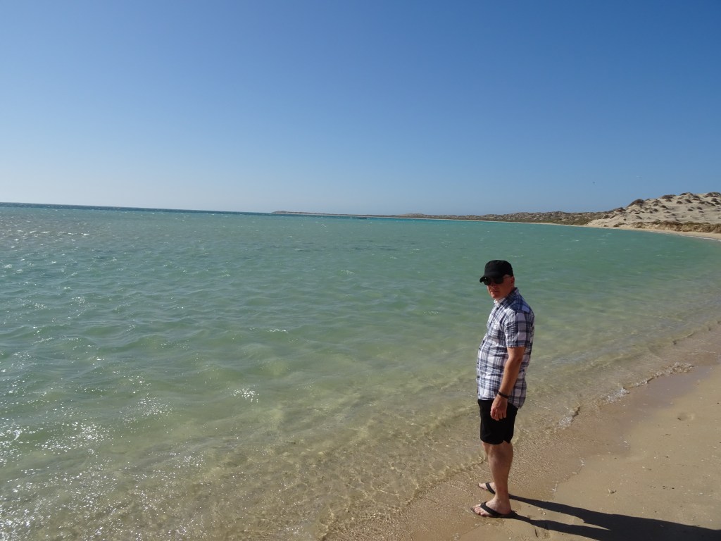 There is a very long stretch of beach all the way to the north, so we decided to walk part of that in the afternoon. It’s part sandy, part rocky and without shoes the rocks slowed us down a bit. Eventually we made it to a sign, but because Mr Orange Legs didn’t have his glasses, he didn’t read it. We were at a small bay within the bay and chose to wade across it, with the water up to our knees. On the other side of the bay we decided to have a swim. Just as we were about to get in the water we noticed a black shadow swimming towards us. Then another, then many more. In fact as we walked further up the beach we encountered about 50 of these swimming black shadows, all within reach and in knee deep water! Some people walking towards us pointed out that these are sharks, something we had already determined for ourselves! Their sheer number was mind blowing and of course I forgot my camera!