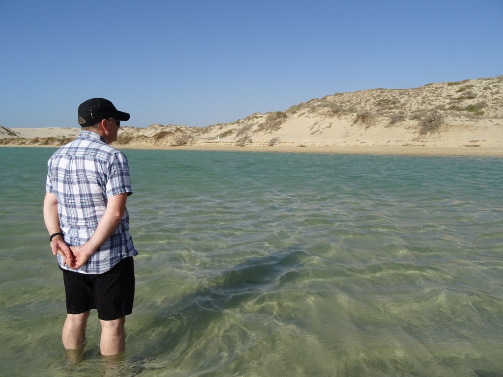After lunch we decided to head up the road to the information centre to check messages, go to the tap for water for showers and then call in at Turquoise bay. Mr Orange Legs: “why is it called turquoise bay”. Me: “because it’s pink!” We had intended to walk down to the south end and do the drift snorkel but all we did was flop into the stunningly clear water and swim with dart and other big fish in the shallows. They are loads of fun, the way they swim around you and stream behind you when you swim in a straight line, as if they want to know where you are going and if they can come along.