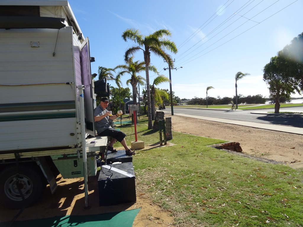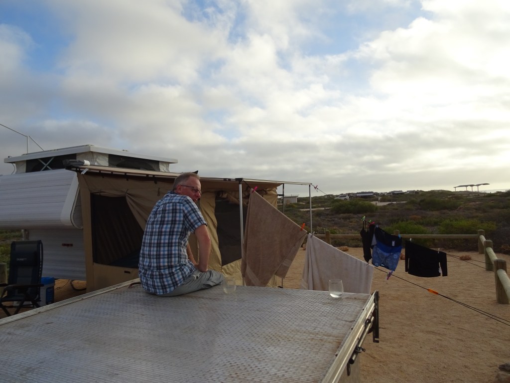 The final 2 sightseeing spots were the Lighthouse, where there are some sandbags made during the Second World War to protect a radar tower on the cape, followed by the Tantabiddiboat ramp where a couple of turtles where cruising. Back home our neighbours were keen to hear about our flight, saying they had come out and where madly waving at the plane as we circled above. We enjoyed “6 o’clock drinks” with 3 other couples and Greg the camp caretaker.