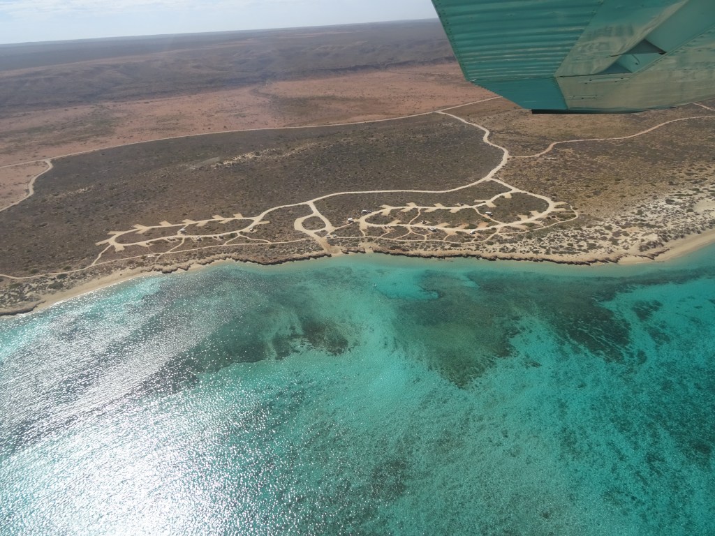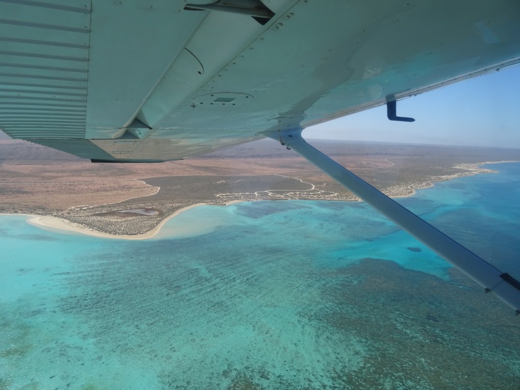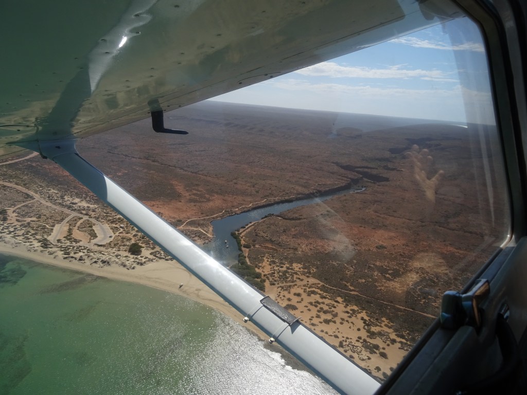 Back to the flight … We took off to the south climbing to 800 feet and turned to the west. By the time we levelled out I couldn’t stop smiling! We we way above the world, tracking between Charles Knife gorge and Shothole gorge. Both looked spectacular from the air, with a path joining the two, although the walk looked strenuous and would be extreme in this weather. Soon we had the sea in sight and made a bee line for Turquoise Bay. From the air both the bay and the drift beach were beautiful. The turquoise colour is vivid. Tiffany started saying “there’s a turtle” pretty much straight away. I was too busy loving the view. We tracked down the coast to our campsite where we did a plane wave and looped around our little camper. “The towels are dry”. Next we headed further south to Yardley Creek, flying along the edge of the gorge and turning around at the end, where the 120 year old Osprey nests are. Back to the coast we cruised along, spotting manta rays, eagle rays and dolphins. The more you look the easier it becomes to see them. The mantas a Batman symbol shaped. The pod of dolphins looked like thin silver lines, some crossed over others depending on their depth in the water. The eagle rays don’t have the lobes like the mantas do. Then I could make out the turtles. On the dark blue to black water, they were small brown dots. Not so small actually. I could make out their flippers moving through the water. As we came back up the coast, approaching Wobiri beach Tiffany looked for a spot where she had seen “a couple of hundred” turtles on a previous flight. Without much difficulty she found the spot, probably because there were actually more like 1000. The photos below are labelled. Click on them and zoom in. The dots are the sea life. There’s one for the turtles and another for the shark school on the eastern side, in the gulf.