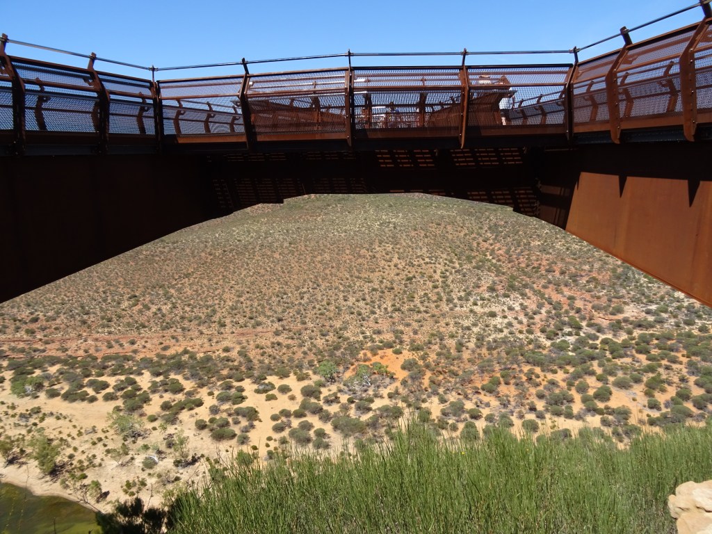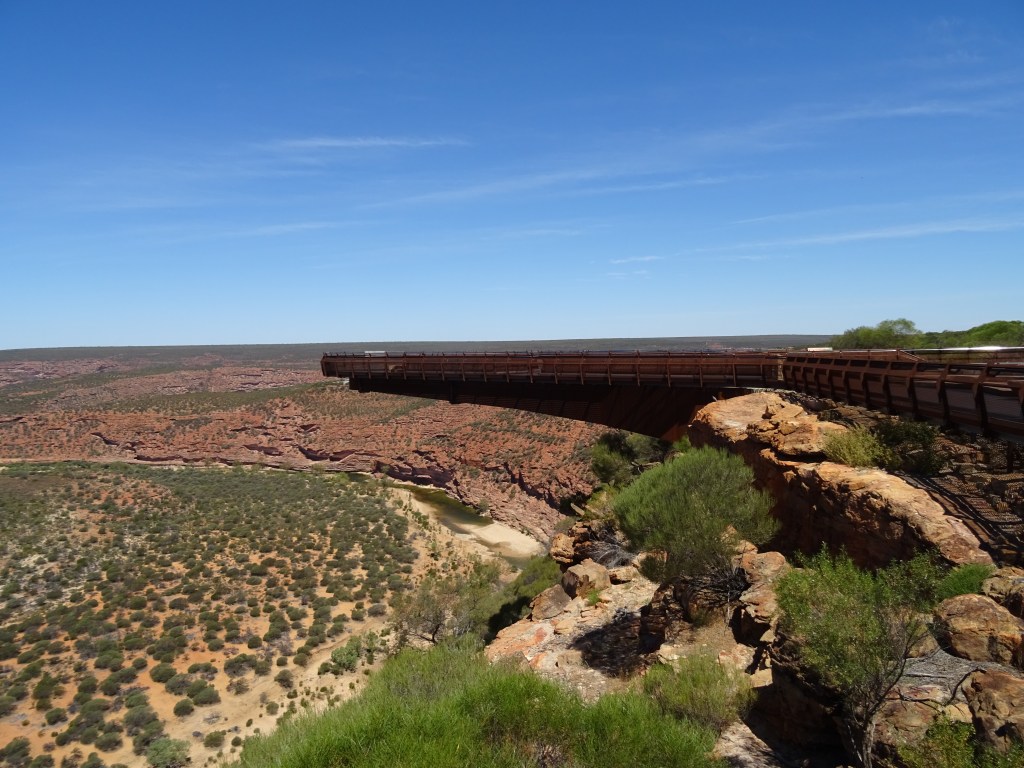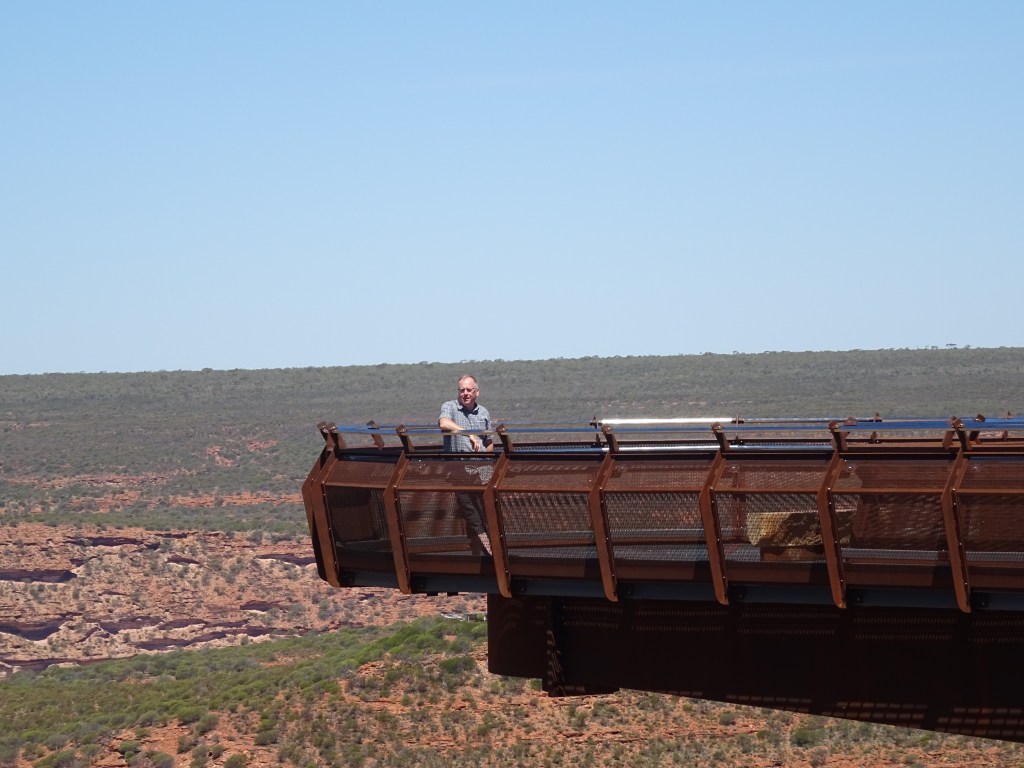 Just in time for lunch, we arrived at the new Skywalk in the Kalbarri National Park. There are actually 2 skywalks that project out over the gorge. They are awesome and at one point, for a very short period of time, we had one of them to ourselves. Can you see Mambo Man on the end of the walk?