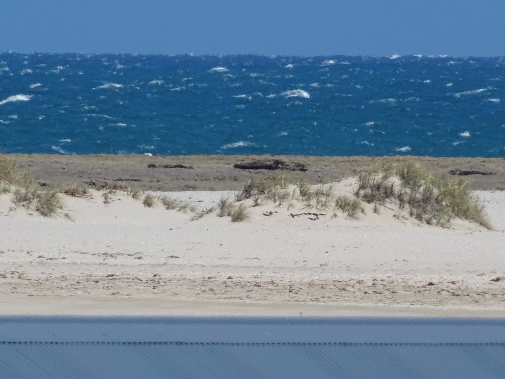 Finally we fuelled up and really hit the road for a few rough hours in the car. The wind was totally against us all afternoon. We saw dust Willie Willies (do you know what these are little d?) and even ended the day in the midst of a dust storm! Our fuel economy was horrendous; at worst we used 20.88 litres of diesel every 100kms. Mambo Man drove the whole way, but we had some good tunes thanks to my DJ’ing! Most of the way we were driving between the big red desert sand dunes. In this part of the world the desert goes all the way to the sea. At our camp at Osprey Bay the short gravel road traversed 2 red sand dunes to meet the white sand dunes. Such dry, desolate, dusty land meets beautiful blue, clear, life filled water.