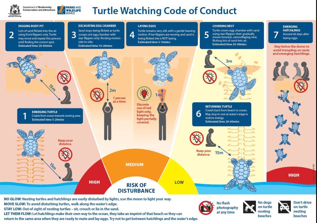 Back home for lunch, and a rest out of the sun, we packed up the awning tent before the wind took care of it for us! The little camper looks so different when it’s all naked. It looks little. Just don’t tell Mambo Man that it looks cute. He hates that! We also wandered over to our neighbours house to ask them about seeing the turtles lay there eggs. They advised we head to Wobiri for sunset and we should be lucky. So that’s what we did. And boy were we ever lucky! We saw about 7 or 8 turtles come out of the water. Having read the guidelines, requirements and code of conduct in the Ningaloo Information Book from the visitors centre (see the picture below) we knew what to do.