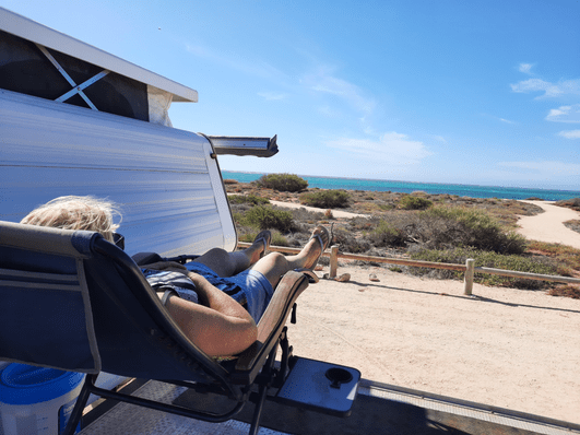 Once we crossed the imaginary line it didn’t take long to get here to Coral Bay. We got the little camper of easily and are set up next to a very big caravan! I think it makes us look even smaller. The caravan park is just across the road from the beach. The water is very very blue. I know there are lots of fish in there because I have been here before but I think Mr Orange Legs will get a surprise tomorrow.