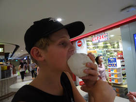 On two occasions we ate in the MRT station at Dhoby Ghaut. The first time we had the chicken curry from a chain that we saw in other places. The Newby choose it for the promise of chicken curry in a bread bowl. Unfortunately, the curry and the (very small) bread roll came separately and The Newby was left very disappointed with his lunch. I ordered the non-bread option and wasn’t any more impressed, thanks to bones in the chicken! Meantime The Piper enjoyed his pork bun and honey soy chicken.