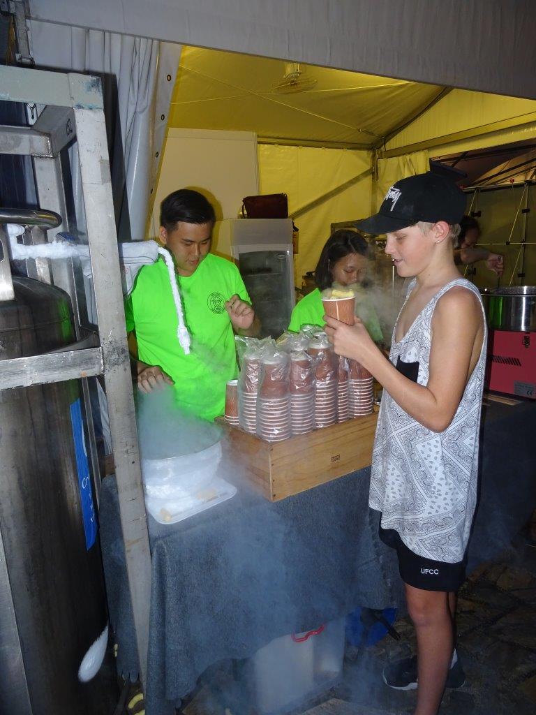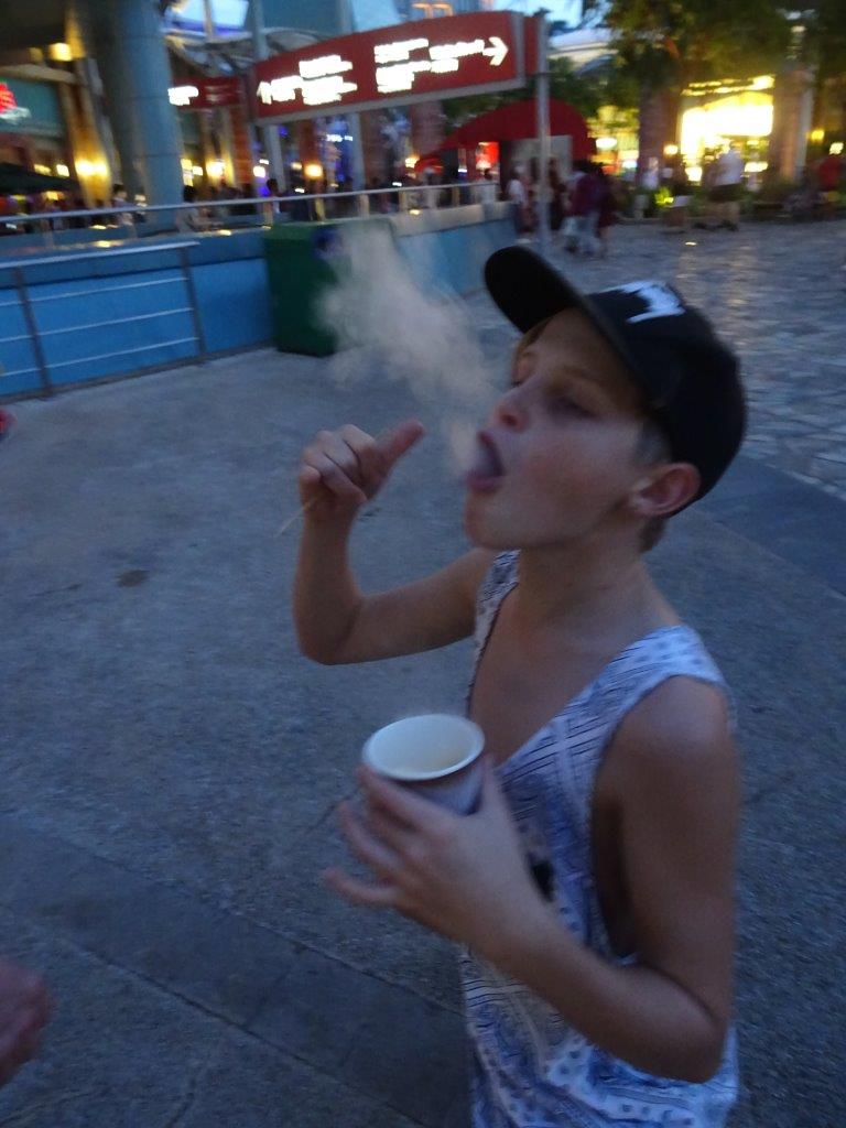 Just outside Universal Studios The Piper convinced me to allow him to try the nitro lollies. As you can see, the result is a frosty mouthful of a banana flavored lolly that creates a brain freeze of the most crazy type. Only in Singapore …