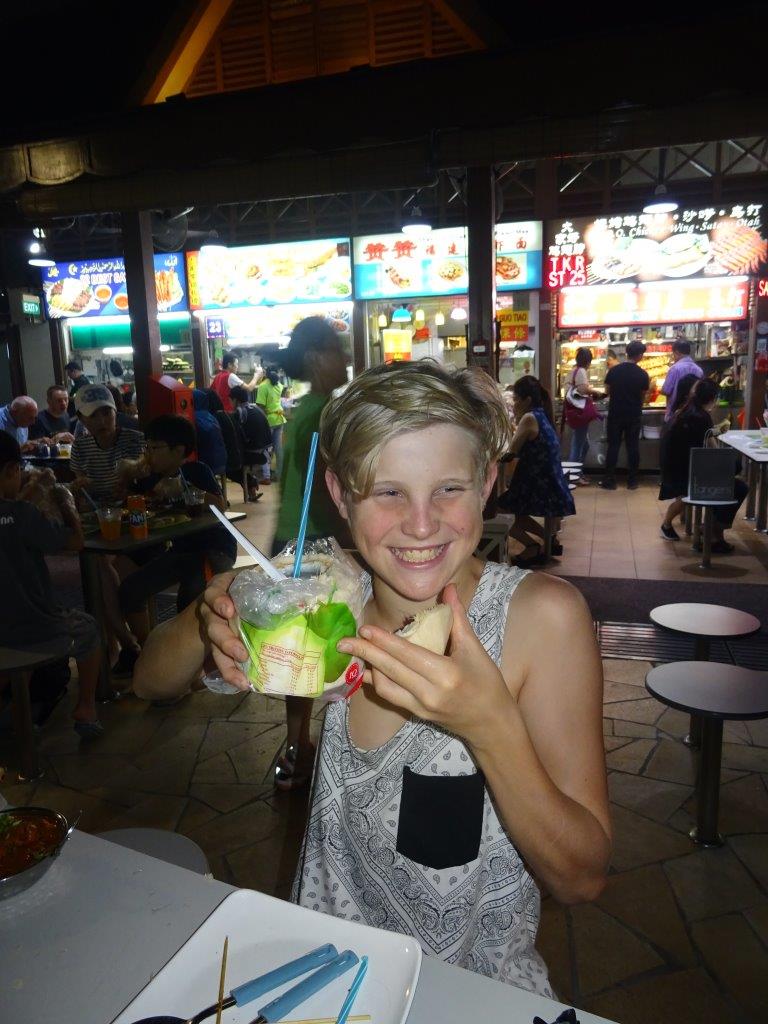 The boys found this on the night we ate pizza but saved it for an evening we could really enjoy it. After a day at USS we headed here with empty bellies and filled them full of cheap beers ($SG4.50 for the tall Tiger bottles) and good food. I put The Newby in charge and he ordered almost one of everything. We shared a lot of satay sticks, followed by rice, curry and lemon chicken, with a dozen gyoza and mei goreng noodles. Everything was great, although I forget to mention no chilli on the mei goreng for The Piper. In toal, with 4 BIG beers and a fresh coconut, the cost was under $SG50 and the atmosphere was almost festive. A word of warning: watch out for the beggars, especially if you have kind kids. They aren’t at all aggressive or overwhelming, but their sad stories are enough to bring big boys to tears. This is a real SG experience that is worth the effort of getting there on the MRT and the stairs over the road.