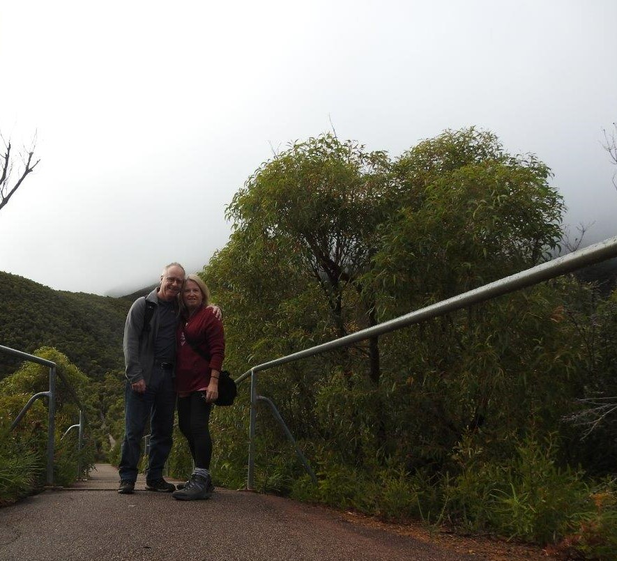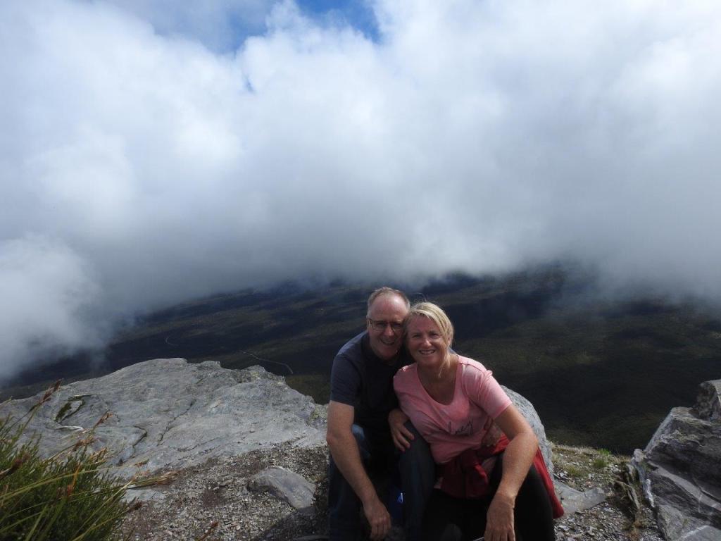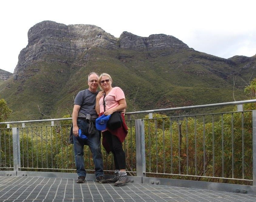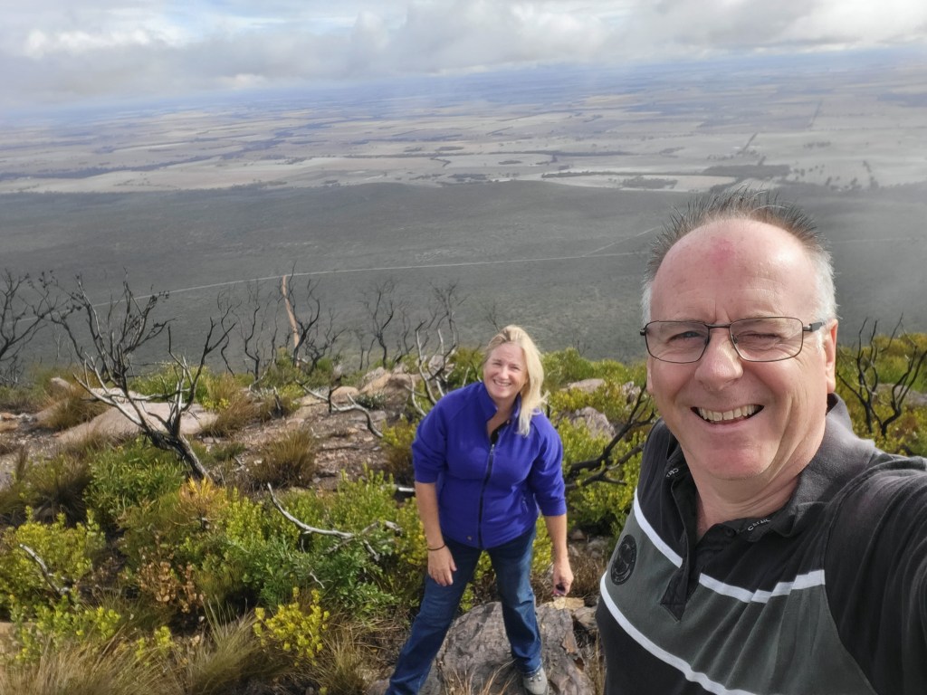 It’s fair to say the weather probably hadn’t cleared up that much, but at ground level. At least, it wasn’t raining and we could see the tops of some of the lesser peaks, so we made the call to have a go at climbing Mount Trio. It’s probably not the greatest idea to head up a mountain in the afternoon, but the sign suggested we could be up and back down again well before dark. There were other cars in the car park, so I was confident that we wouldn’t be the only people climbing up or down Mount Trio. So off we headed, straight up! The straight up is the reason why I wanted to climb, Mount Trio. Last year when we were in the Porongorups, I noticed this particular path leading up this particular mountain, when we drove past on our journey home. So it seems like a good idea at the time as many things do, but once we start a climbing, I’ll admit to having second thoughts. But once committed It would be a shame to admit defeat. Fortunately the weather was mostly on our side, and stayed relatively dry as we struggled straight up. Being weekend climbers our fitness level is far from optimal, but we’re not completely unfit either. So we took our time, took lots of breaks and eventually made it to what we thought might be the top, only to realise that there was more path to the top around to our right. So we kept going and going a bit further and then going a bit further and finally we arrived at the top of the world.
