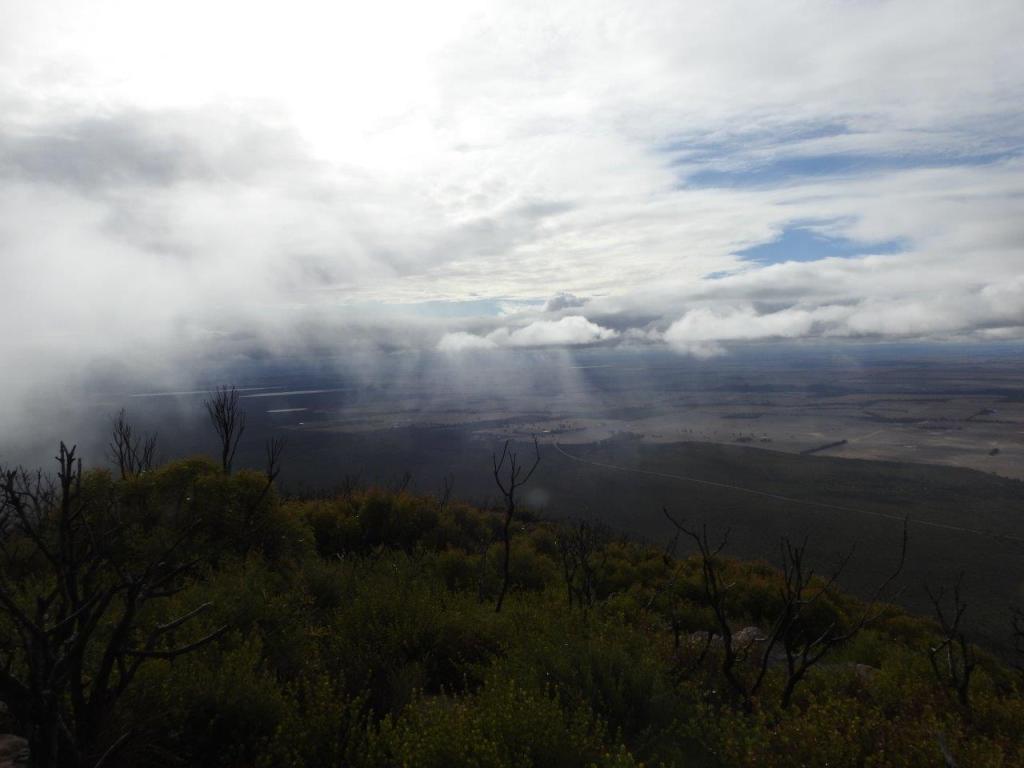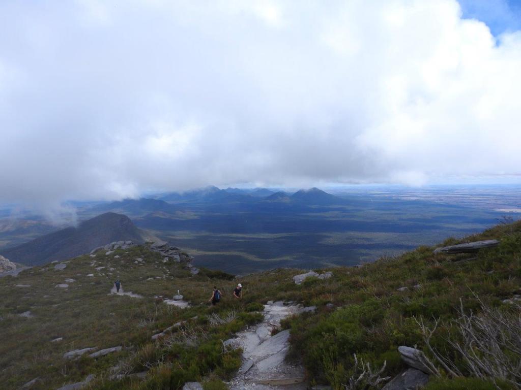 As luck would have it, the weather cleared so we could see almost 360° around us. To our north we could see the beautiful farm plains leading back to where we spent last night. To our East Bluff Knoll remained shrouded in gorgeous silver grey clouds. To our south, we could see the Porongorups and make out the mountains we climbed last November, when we hatched the plan to come back to the Stirling Range and climb these mountains. And to our west, we could see the range travelling off towards the coast. While it was mostly clear skies, there were minutes where we would be in the clouds, barely able to see our surroundings, and then the wind would take the clouds away, and it would all be revealed again. We were also privileged to have it all to ourselves. I guess maybe we were the only ones crazy enough to be out on a mountain at this time of day. Eventually, of course we had to descend.