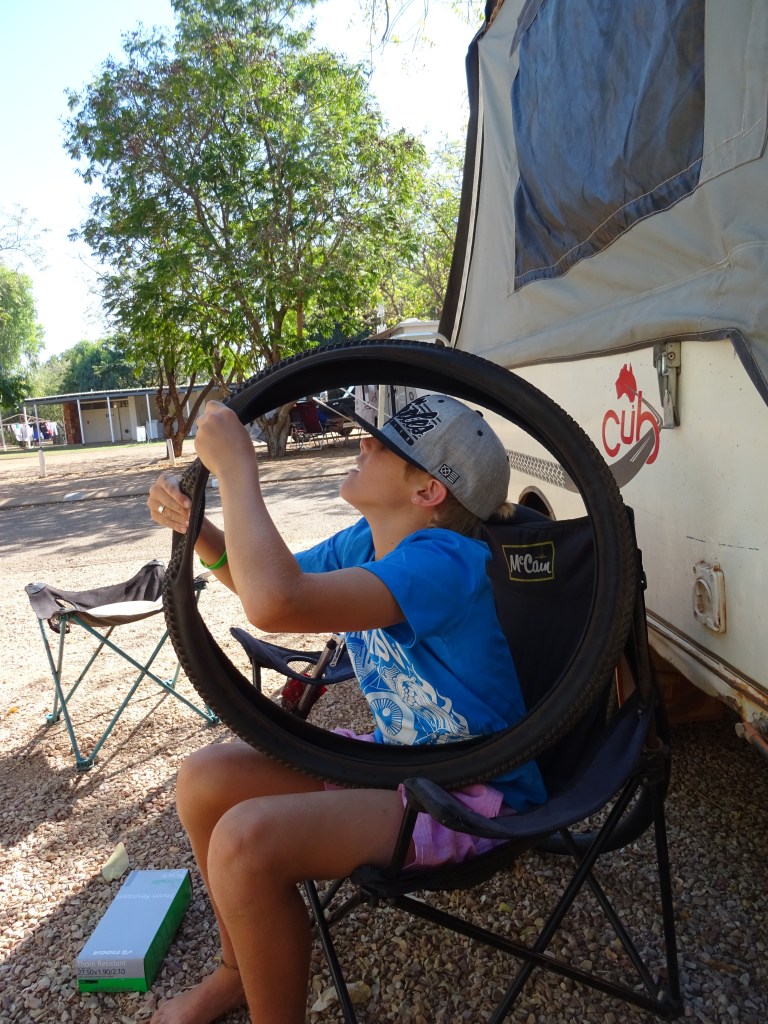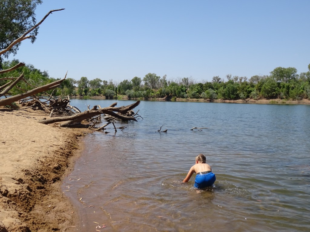 About 11pm I got a text to say my trailer was in town! I can’t say I slept soundly but I slept and woke more concerned than I’d gone to bed. The cold light of day. However all was relieved with an 08.30 phone call to say the trailer is easily repairable, first thing Monday morning, with a couple of welds and a new tyre! Yahoo! We cruised around to collect the cold stuff from the fridge and drop off the spare and our day was our own to head out to Geike Gorge. It involves a boat ride that The Piper wanted to do and then didn’t want to do. So he had a swim, we had a look at the gorge from the boat ramp and we were home by 2pm. I’ve cleaned the car, repaired the drawer in the back, washed the dust off and cooked up some sausages. We have our room for another night but not tomorrow so the trailer needs to be repaired. I can wait for a spare if needed in the van park.