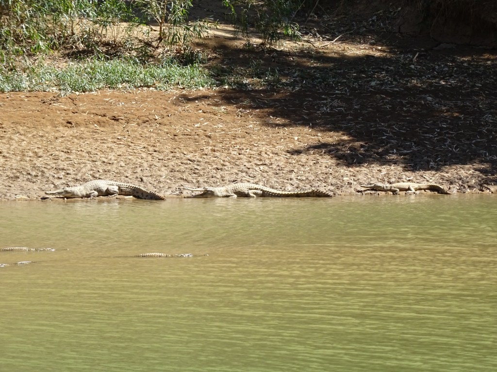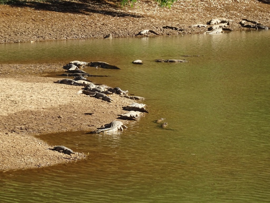 This morning (day 25) we walked all the way into the gorge which didn’t prove to be that exciting but we did see a whole lot of bigger black bats (apparently they are flying foxes) and an Agile Wallaby. And of course, crocs. These are freshwater crocs and are just inside the gorge, very close to the day area parking. The literature says there are 70, the ranger said there are about 140, I counted 82 and a fellow camper counted “more than 100”. There’s a lot. More crocodiles than logodiles. In a very small amount of water in what is a huge river bed, it would be magnificent to see it in the wet season although how you would get here is anyone guess. I suppose some time in the future the roads will be paved and the whole Kimberly West more accessible but for now, it’s not.