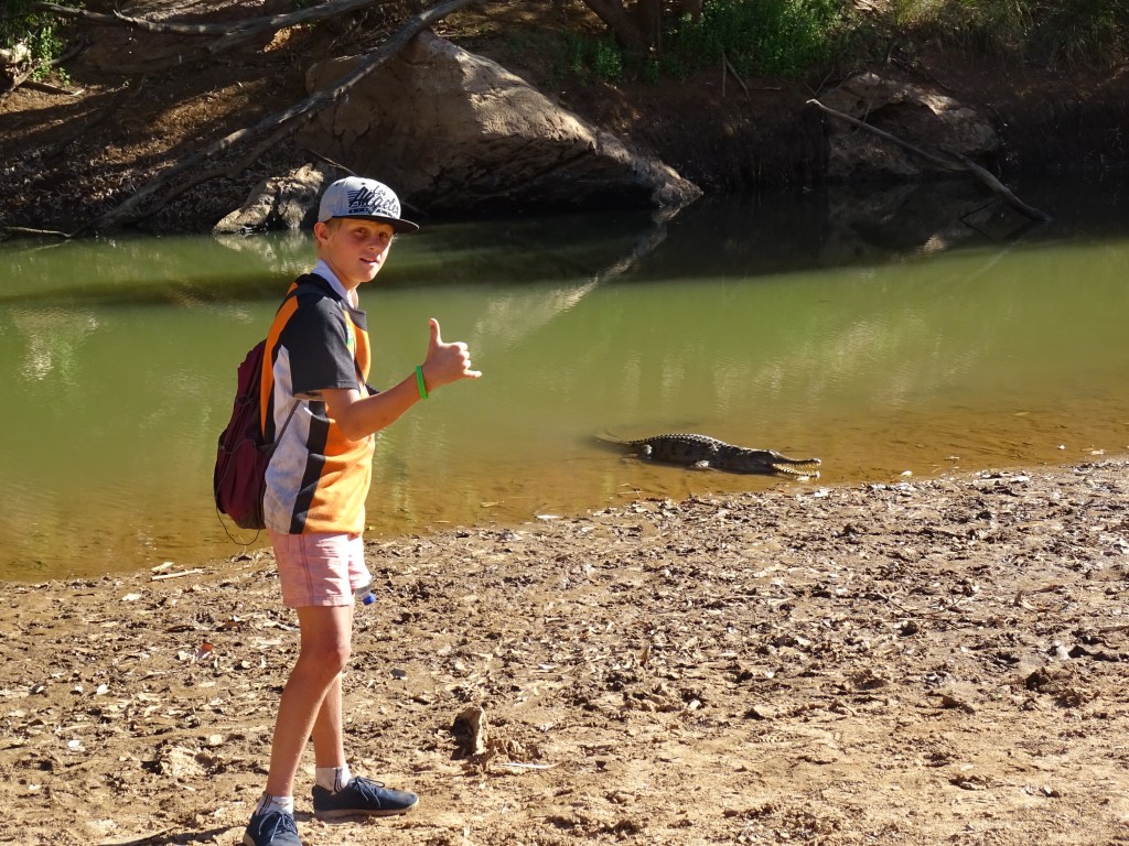 Our afternoon involved a set up, and then cooling down in the shade before a nice shower and a walk into the gorge. What an amazing sight. Crocodiles galore and colours that changed every few minutes. We stayed in there until we were the last and then saw a pair of Tawny Frog Mouth owls and some bats. Little ones that look like little swifts flying around. More animals to add to our list. The Piper got a book, “Mammals of the North West” and has been having a great time identifying poo. In the evening we had a fire with our wood that was almost sabotaged by some fellows campers who took it upon themselves to start our fire. To say The Piper was devastated would be an understatement. Fortunately they were having no luck starting it and The Piper got it sorted and was happy again. Baked spuds for dinner …
