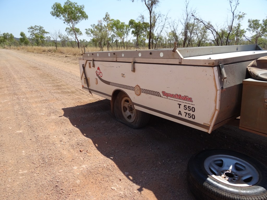 Following a nice little snack and a laugh we started off toward Fitzroy Crossing, The plan was to make the roadside campsite, check the time and head on through if it was early enough. Unfortunately it all went to shit about 10k from Tunnel Creek. A flat tyre. With 60k of dirt road to go The Piper was distressed so my stiff upper lip was front and centre. With a can do attitude I got the spare tyre off the trailer just as a car came along. I flagged them down and requested the help of the lovely man and his family. Just advice, I was happy to get dirty. But, as it turns out, the flat tyre was due to broken brackets, left and right, that hold the leaf springs in place. He proceeded to explain the problem and that replacing the tyre with spare would be futile.