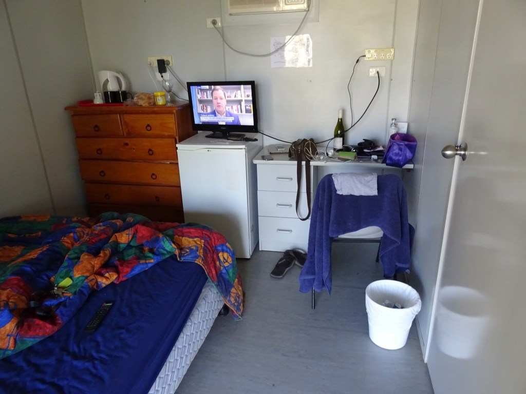 He also suggested I call RAC back and upgrade. A new telephonist and a clearer explanation on my part and $140.00 to upgrade and I saved myself a small fortune. The towing fees are $3.30 / km on bitumen (82km) and $4.40 / km on dirt (110km). My upgrade entitled me to 200km in remote Australia! Eight kms to spare! Yahoo! First win. Next, find accommodation. In a mining town. Nothing cheap and only available until Monday! First tonight, then worry about it after that. Worst case scenario the trailer can go to the van park and we can stay in it awaiting parts … Julie in the van park helped me find a donger at $150.00 for the night and The Piper and I were there and settled in by 4 at the hotel. With many patrons. Having showered we headed up for a meal in the restaurant before a night in front of the TV.