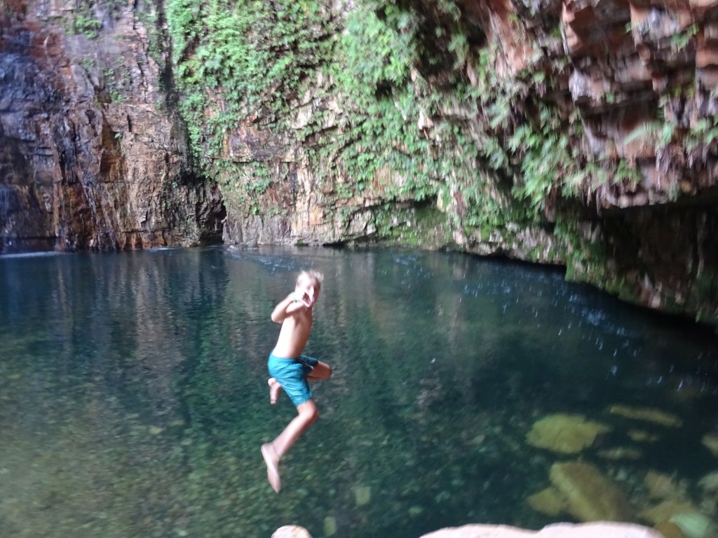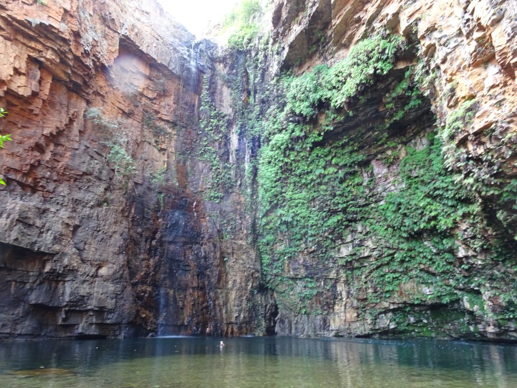 The pools are a simple two or three minute walk from the car park which is about 10k, on gravel, from the Gibb River Road (it may be more or less). Although the maps say that this section of the Gibb is unsealed, it has recently been sealed so this site is very accessible. After the springs closed we headed back to Emma Gorge and had lunch and a milkshake before walking the trail into the gorge. We had heard that the gorge had a pool in it and a trickling waterfall. Indeed, it had a most amazing pool of water and a stunning waterfall as well as droplets on at least one quarter of the pools edge. But I’ve jumped the gun. The walk in is graded “blue” and required an hour over a variety of terrains. I estimate The Piper and I did it more quickly than that, but arrived at the end of the gorge very hot. And very overwhelmed and excited by what we found! You don’t have any idea what you are going to see until the last few metres.