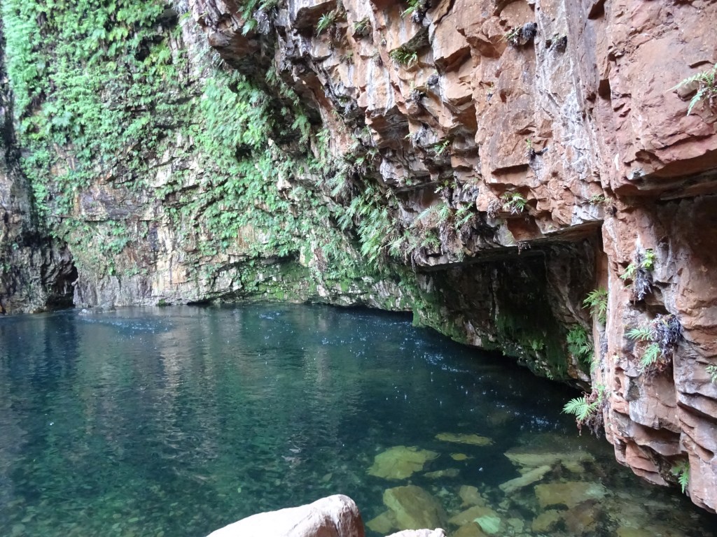 The gorge ends at the pool and is surrounded on three sides by towering cliff faces between 70-90m high. The whole area is 1800 million years old (no typo) and is awesome. As in, it creates some amazing awe! The cliff faces are covered in ferns that are watered by either the falls or the droplets. There is a tree root the length of the falls, almost dangling in the water. There are a variety of ways that the water enters the pool, not only via the falls but also from the droplets and some thermal springs. The springs create areas of warmer water at the edges, attractive to those that don’t like the cooler water. We swam the entire thing, despite cramps in my feet. The water was pleasant and the crevices and cracks were intriguing to look into. The Piper jumped from the rocks and the waterfall as I floated on my back from the falls to the beach, staring up into the top of the gorge and the blue sky above. We though Zebedee was good but this was amazing and we spent over three hours there, returning the to the car after 5, as the sun set.