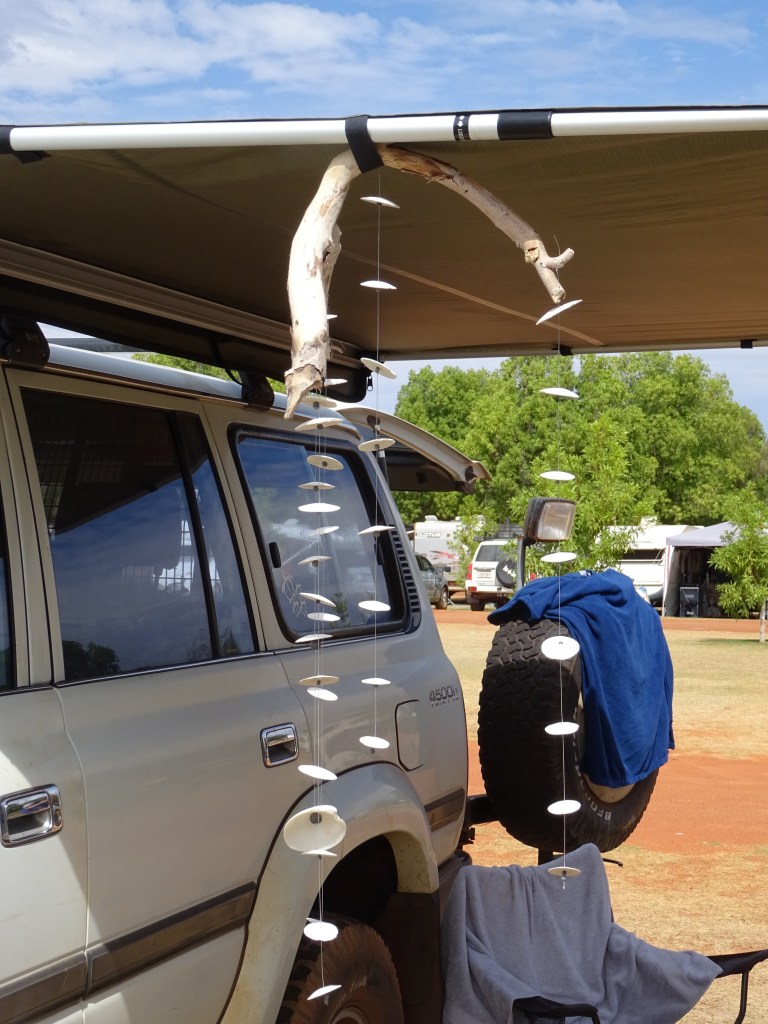 As for shells, the pickings are easy and we have far too many. In fact the bucket was so heavy on our walk back we had to share the load. Nothing big but they are pretty and for an avid shell collector like me it’s delightful. Our wind chime is complete and this afternoon I’ll thread another different one I have in mind. We’re going to drop the awning and take a spin up the beach in the car later today just to say we’ve done it and because everyone else is. We walked south for a long way yesterday so I think we’ll drive north. Then tomorrow we are back on the road. Assuming I can get the coconut harvester into the car. He’s found coconut trees, armed himself with rocks, a stool and a broom, and was last seen bongo drumming the stool off into the distance. Here’s hoping he doesn’t knock himself out with a falling coconut … And you thought he was a piper!