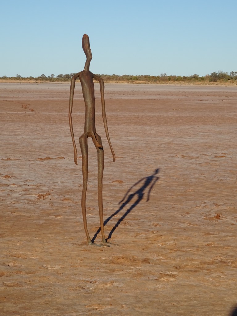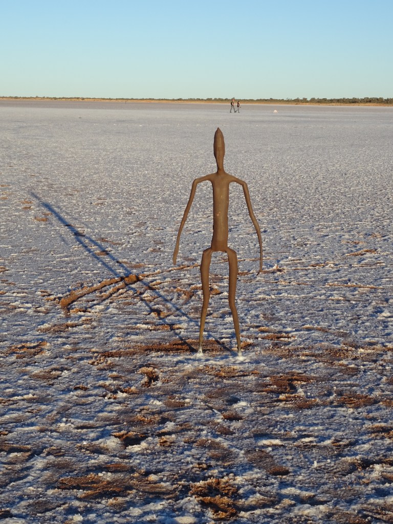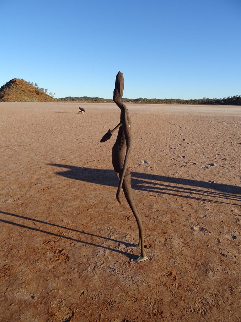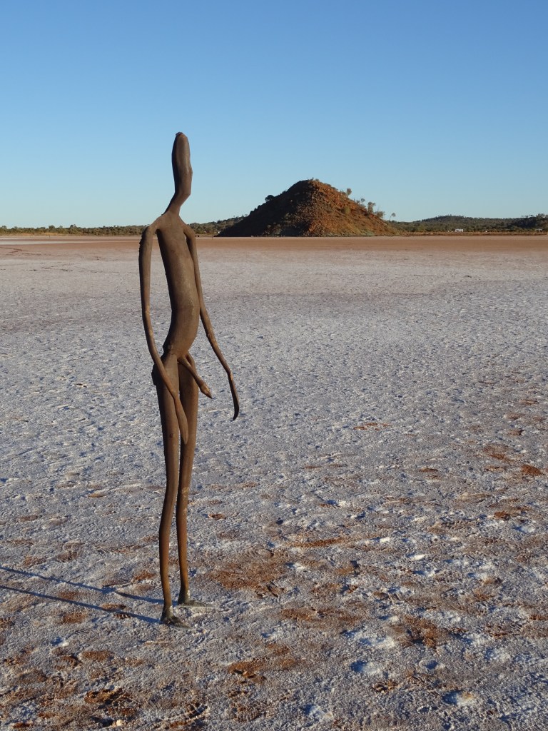 Given that our geocaching subscription renewed last week, we need to stash a few caches on this trip, so we wandered the racecourse (that’s a very generous description of what’s left) and found our first. Scared off by the “go away” sign we headed back to the car and on our way to Menzies for a milkshake and coffee before heading out to Lake Ballard. There is something you need to understand about lakes in Australia. They don’t all have water. This one is a salt lake, covering a massive distance, not unlike a lake full of water