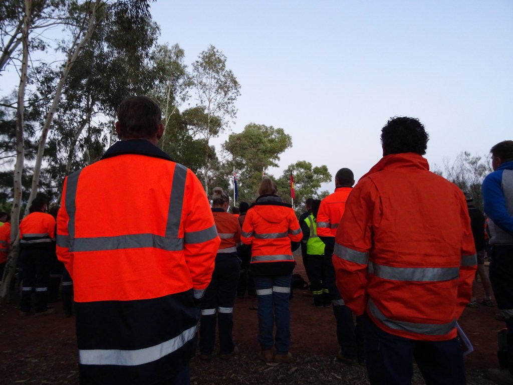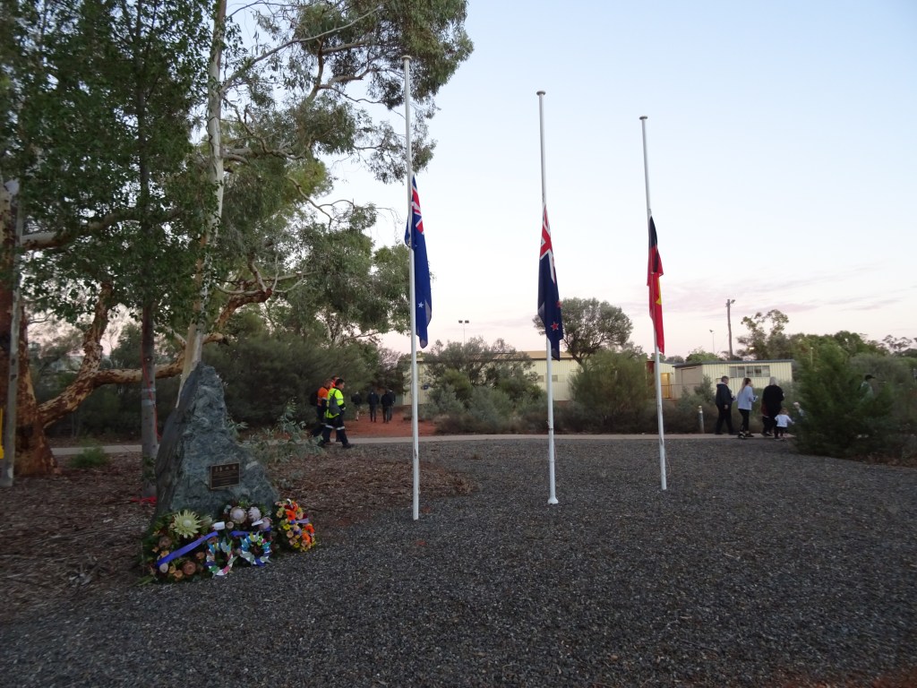 At early o’clock we got up and ready to head for the dawn service. I didn’t expect many folk to be there but in fact there were at least 100, maybe more, all in hi vis except for the 3 of us! In keeping with other services we have been to the service followed the moving sequence of the last post and revelley. At the end of the minutes silence and completely unexpectedly, there was a piercing scream from our left. We were all shocked. The Piper and I exchanged worried glances but quickly we realised a lone Maori man had started a Haka. The whole crowd was silent as he yelled his emotional war cry into the early morning. It was clear that he was putting his heart and soul into the impromptu display of tradition. As he continued, a second man slowly moved from in front of him to slightly behind him and joined in. Together they fiercely displayed their warrior culture before. It was truly an amazing minute or two, capping off one of the more memorable ANZAC Day services we have attended. With the formalities over it took just moments for all the hi vis to disappear into buses bound for shifts in the mines, leaving us and a few others standing in the shadows of the flags at half mast.