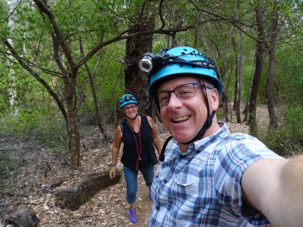 Yet another leisurely camping breakfast. What makes them so good? It’s hard to say but maybe it has to do with the fact that we are outside, we aren’t rushed to get ready for work, we have good coffee and often some fresh local bread or preserves. We have fabulously comfortable camping chairs and a small screen that we watch the news on too. So breakfast is just a lovely time of the camping day. After breaky we decided to head out and bag a very close by geocache. Brides cave was once open to the public but then along came a fire that burned down the stairs and so it is now only accessible to abseilers. The cave is completely unsigned from the road, so without geocaching we would never have known it is there. I thought it was a great spot to try out the drone but in hindsight it could have, and nearly did go bad! Fortunately I didn’t lose it in the huge hole, nor smash it into one of the massive Karri trees. After looking unsuccessfully for the cache we headed just slightly further down Caves Road, stopping to walk into the amazing karri forest, where the fairies live. My drone only flies to 30m so there is no way the height of these trees can be achieved by the drone, some of them reaching more than 100m into the sky. It is a very pretty place.
