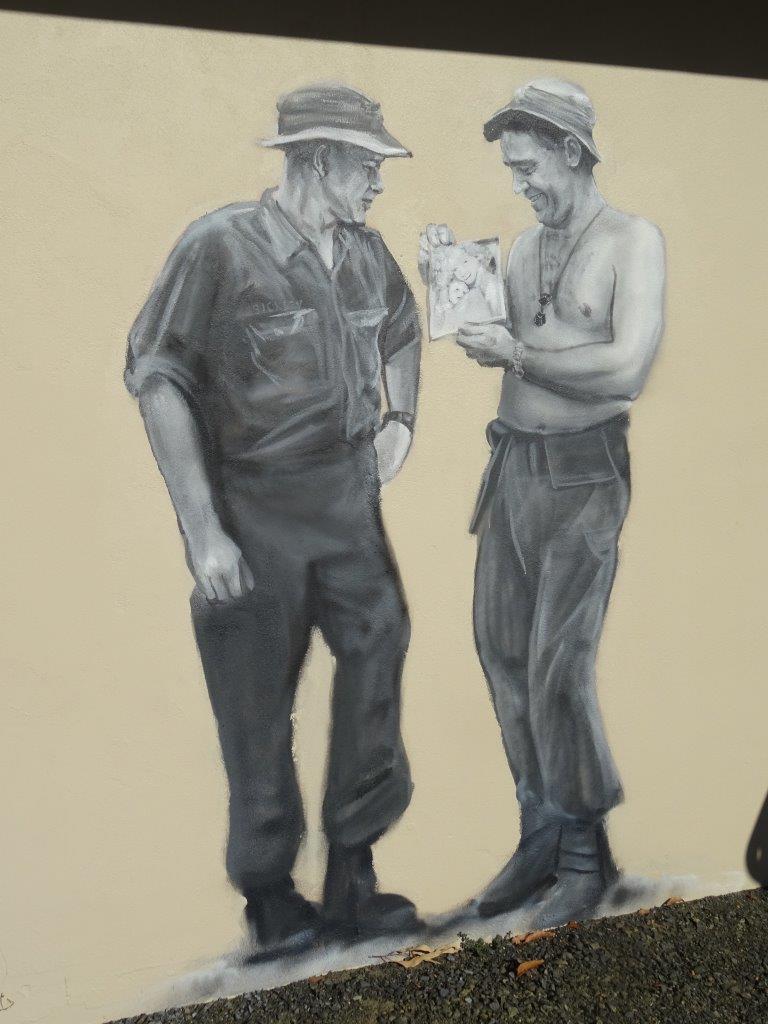 The next mural was at the RSL club where the team were able to toss a penny with the two-up players and smile at the family photo the soldier keeps in his pocket. Of course, the team paid their respects to the nurse among the boys, before the tour course took them across the road and into the local handicraft region.
