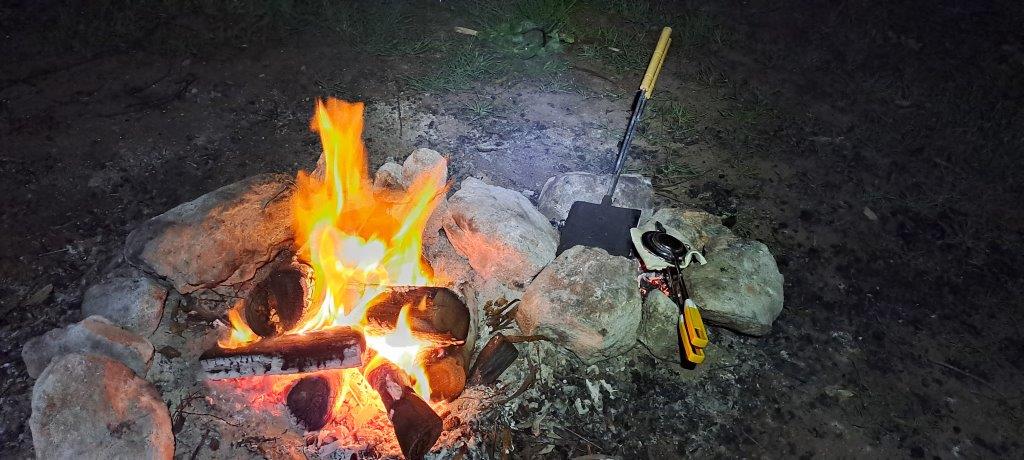 As usual, we set off after work on Friday, arriving at the campsite in time for a fire to be built, started and blazing just as gin o’clock started. We chose a campsite at the far end of the space, away from the only other people there at the time we arrived. The space is a big paddock, and we managed to park up next to a lone, limb dropping tree. There is a flushing loo at the adjacent day use area and potable water. Almost glamping.