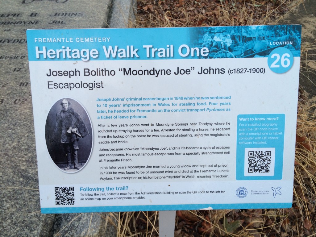 Joe laid low for a couple of years and he was yesterday’s news, when he was recaptured in what can only be described as a chance apprehension! The poor bloke tried to steal some good wine from Houghtons at the same time some police were imbibing a few refreshments, and before he knew what happened Joe was back in the clink. Despite the Governor’s commitment, he spent 2 years there, before a new Governor gave him a ticket of leave, finally honouring the promise! Aged just 45 (younger than me) Joe was free to go. He eventually married a much younger girl and spent the rest of his life roaming around, getting in a bit of strife and perhaps spending small amounts of time behind bars, before going completely off the rails and dying aged 74, in the Fremantle Lunatic Asylum (which he escaped from 3 times!).