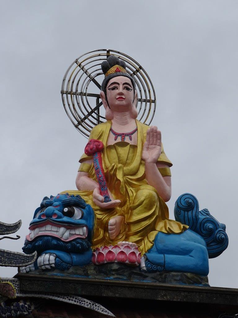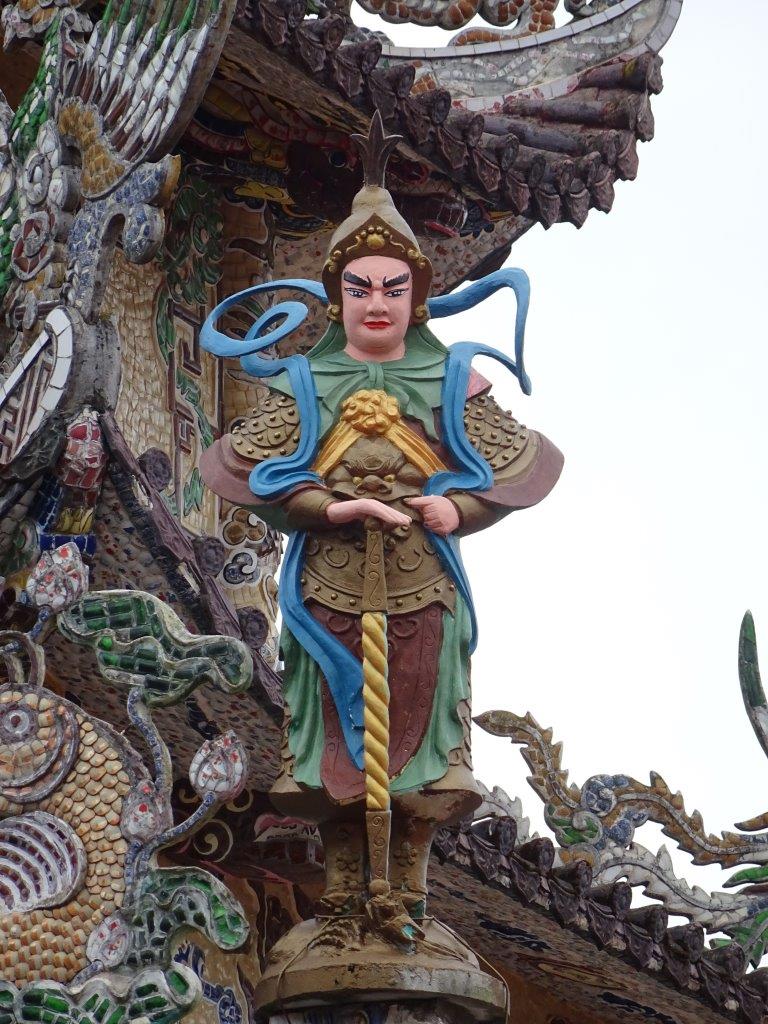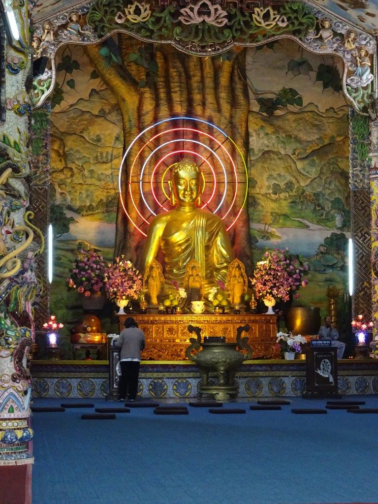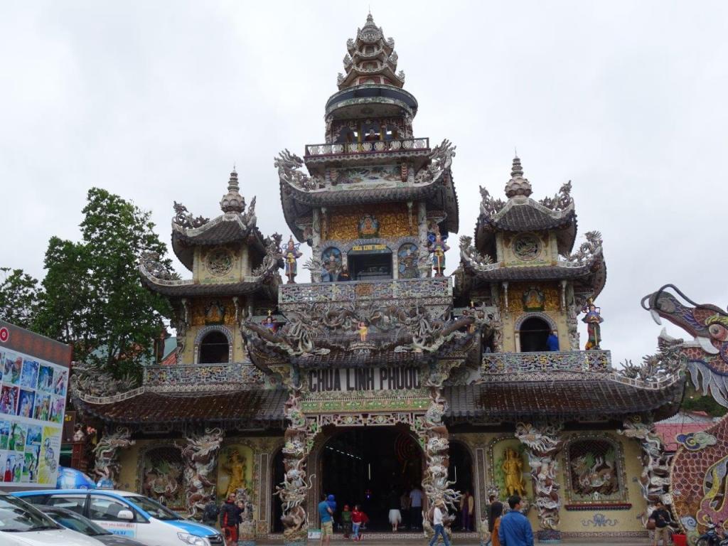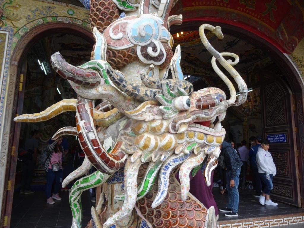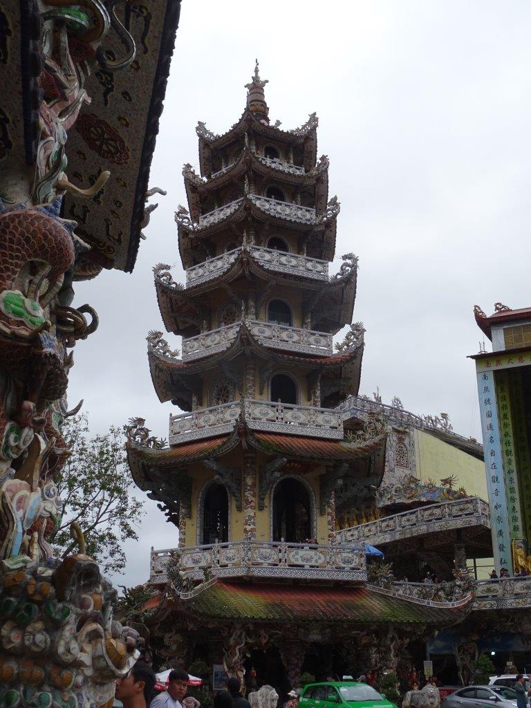 Next stop was some decent coffee in a cafe a short walk up the hill. This coffee was much better and a quarter the price. With milk, 12 000d, without 10 000d. And we got free tea with it. The tea is something you get free everywhere. With every meal. When you enter almost anywhere. With coffee. Mostly it’s not too bad, lightly perfumed, but it’s still not my thing. After coffee we headed for the train station, bought our VIP1 tickets and trundled off up the line to Trai Mat, to visit the Linh Phuoc Pagoda. The trip was ok, past the flower green houses and the homes, to the station in an old style carriage. We walked the 200m to the Pagoda which is huge and very gaudy. If you look closely at the mosaic work you’ll notice that it’s mostly made of broken bottles. I have noticed this at other Pagodas too. This one is too over the top for me. I prefer my Pagodas a bit more understated.