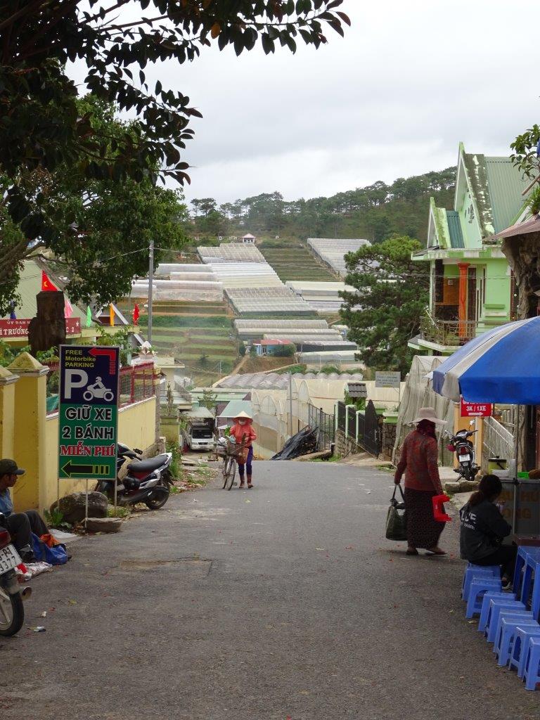 We have just finished a quiet day in Dalat, wandering about following a self guided walking tour from another blogger. We did most of it, just missing the first couple of things. We started with a very western breakfast. In fact we have eaten western food all day. After eggs benny and coffee (the Vietnamese kind) we started the walk with a stroll through the foods markets. They are hard to describe but encompass everything you can think of. The most colourful part is the rows and rows of dried fruit, seeds and nuts, closely followed by the fresh fruit and veggies. There is so much I didn’t recognise. We also wandered into the meat market. Women were chopping every kind of meat, as future cuts looked on. The caged chickens really didn’t need to see their fate.Outside there are stalls selling just about everything else that is available on the planet. Fresh flowers, hardware, bras, toys, cookware and clothes. The sights and sounds are amazing and no one seemed to mind 2 westerners wandering around absorbing it all.