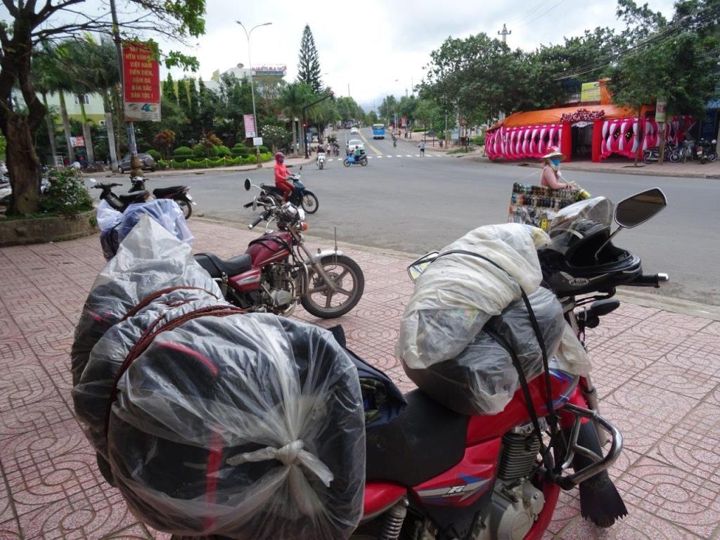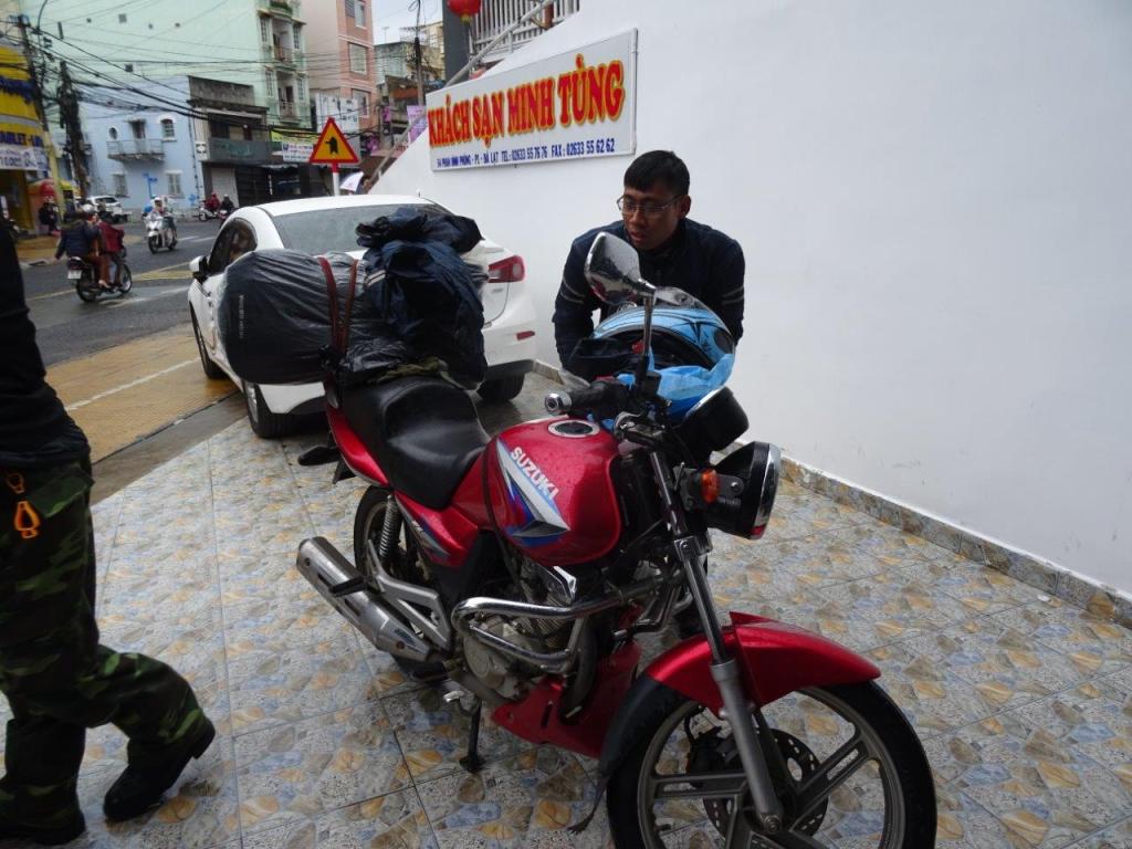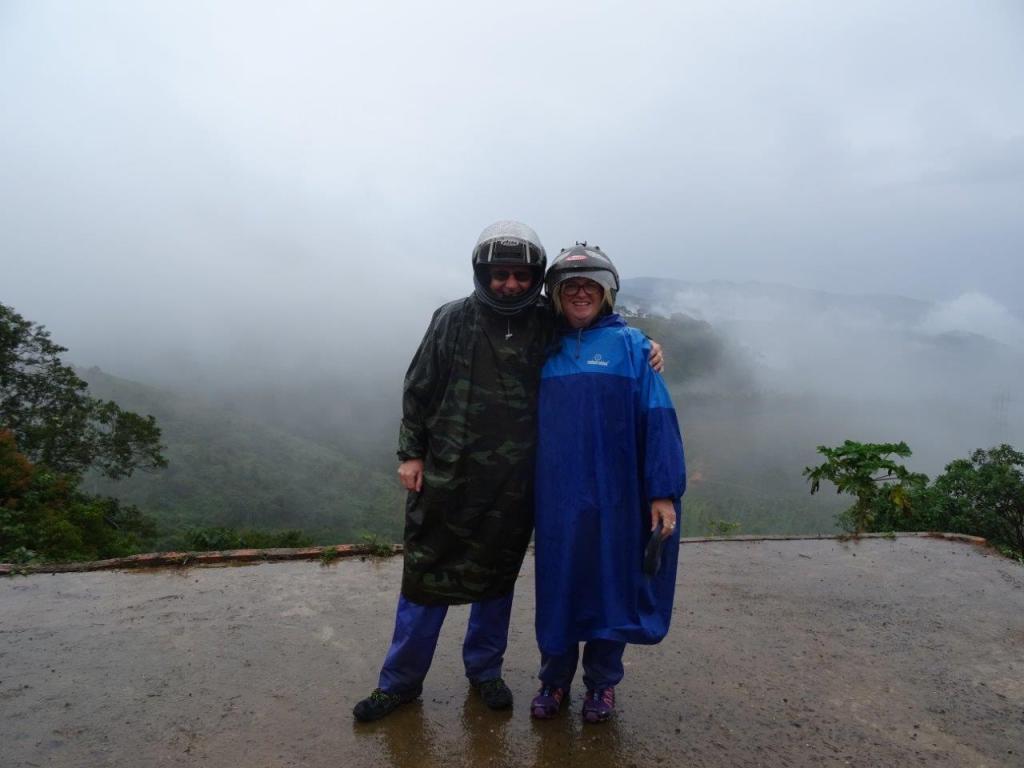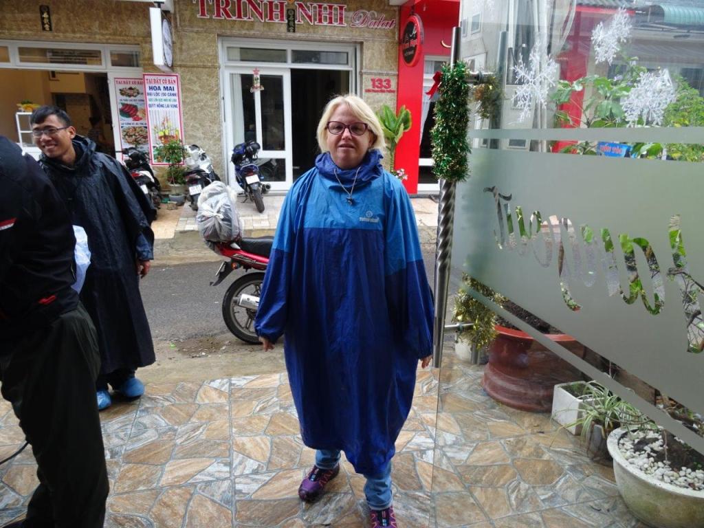 We started just at the bottom of the lane where we were staying in Dalat. The 2 riders showed up, as expected at 08.30 to collect us, on the bikes! I don’t know why, but I thought we would be picked up by car. Silly me. The Newby’s friend and rider is Sunny, while I’m riding with Tuan. After a pit stop at the office, we were on our way out of Dalat. Our bags are tied to the back and front of each bike. I have no idea where their stuff is. We started out in some wet weather gear thanks to rain that started over night and hasn’t stopped.