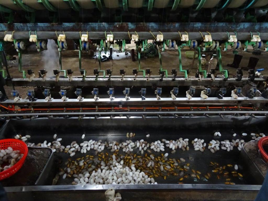 Onwards on the bikes, we headed for a silk production place. The entire process, from worm to fabric is covered here. We always had silkworms when we were kids. When the moths came out, they did crazy circles for a while before dying. In this place, they use a variety of methods to stop the moths from releasing an enzyme to break out of the cocoon. The breakout breaks the threads and renders the cocoon useless. With the cocoon intact, they are immersed in water, the end of the thread is found, it is wound into the big machine with a lot of threads from other cocoons, and the machine winds the threads off the bobbing and rolling cocoons. When the spool is full, it is transferred to another machine to be readied for weaving. Finally the loom creates the fabric that is dyed in preparation for use. So the worms never become moths. They end up floating around in the water. In fact, they also actually become food! We didn’t try them, because many people are allergic to them. Tuan has eaten them though.