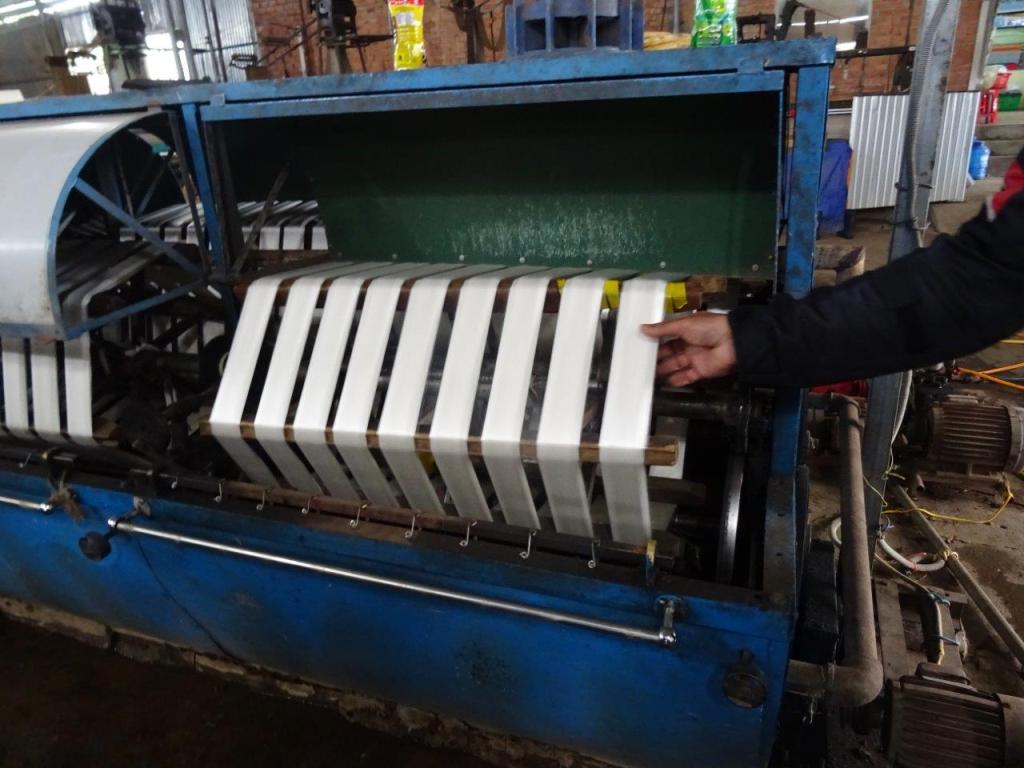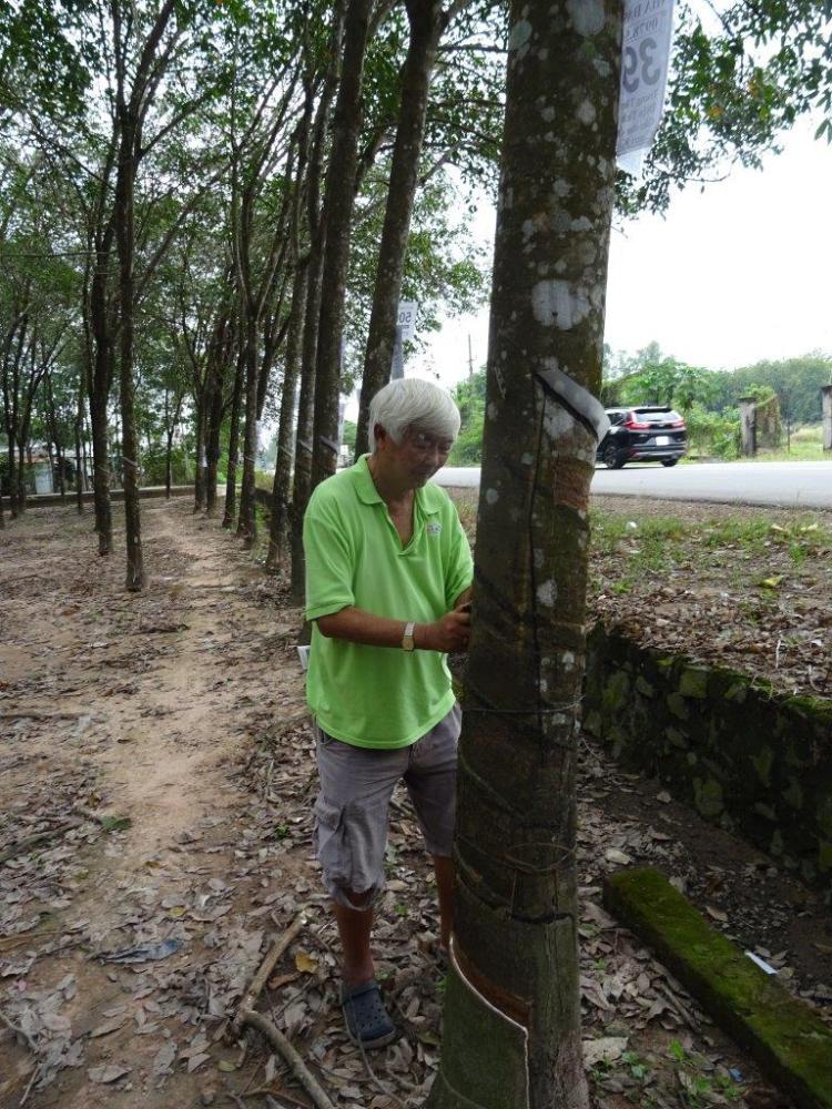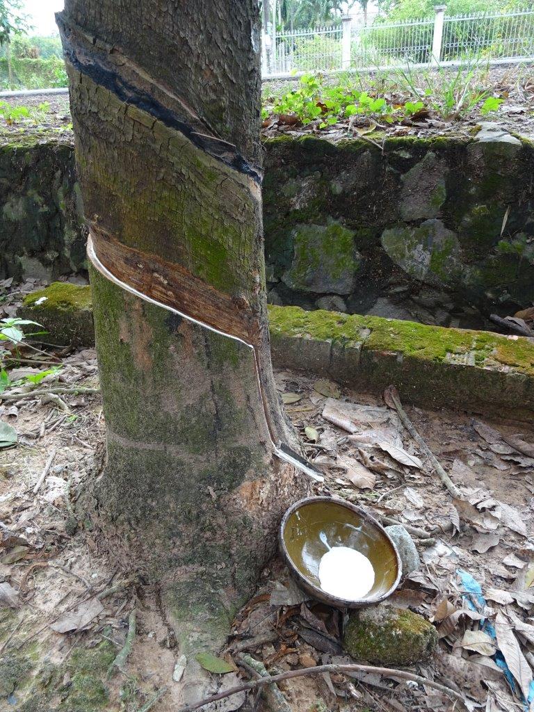 After our breakfast of rice noodles with spring rolls and pork (which I enjoyed) and coffee we were on the road around 9am. Our first stop to stretch our legs was at a roadside rubber tree plot. This is one of the big exports. Again, the whole process is done by hand and lucky for us a farmer was walking through the trees and showed us how the cuts are made. The tree is sliced ALWAYS left to right, from the heart. If it is cut in the morning, the western side of the tree is cut to avoid the sun. If it is cut in the evening then the eastern side is cut. A small bowl is placed to catch the rubber that slowly drips out. The rubber is then exported as Vietnam makes bad rubber products. Apparently you don’t buy Vietnamese tyres for your bike.