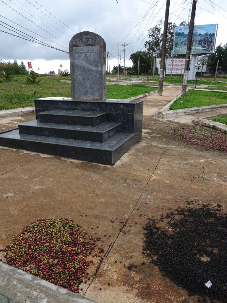Our journey down the road passed many houses with beans spread out to dry. A word on land in Vietnam. Every bit is used. Especially the bit between the road and the house. Beans are dried, clothes are hung, wedding receptions are held, meals are cooked, games are played, mourning the dead occurs, motorbikes are repaired, napping happens and life generally goes on. In full view of the passing traffic. And as an added bonus, this is the Ho Chi Minh trail! THE Ho Chi Minh trail. We stopped at a roadside plaque describing the importance of the road, scored another free history lesson related to the trail and almost touched Cambodia. Guess what else happens at this auspicious site. They dry coffee beans on the paths! Of course.