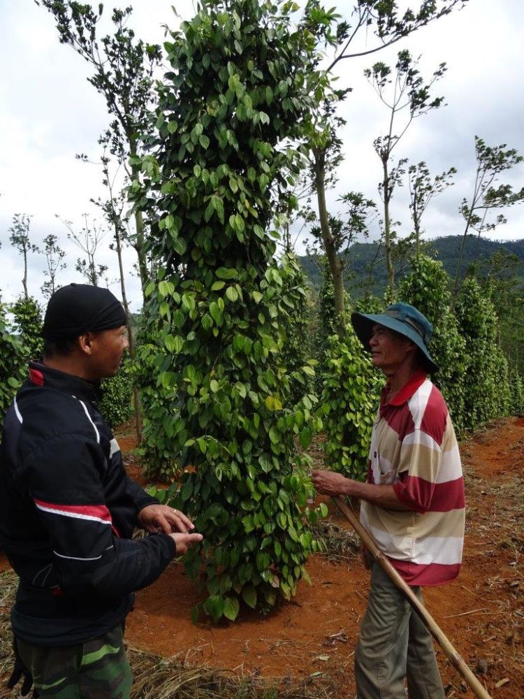 Our next stop was a roadside (of course) pepper farm. Did you know pepper grows on a vine? They grow a host tree then the vine is grown up the tree. Pepper is 1 of the 4 major foods grown in this area of Vietnam (coffee, rubber, pepper and cashews). It used to get 200000 ($12) to 250000 dong ($15) a kilo. It has fallen to 50000 ($3) thanks to supply and demand. Too many farmers are growing it now. Our stop was spontaneous, and a surprise to us and the farmer. Just like our other stops have been.