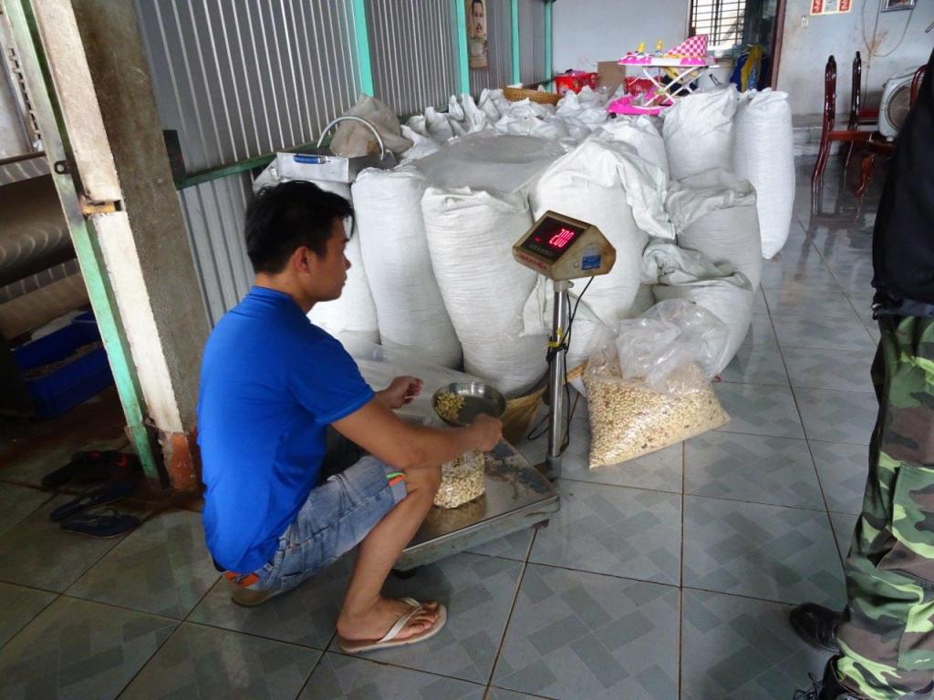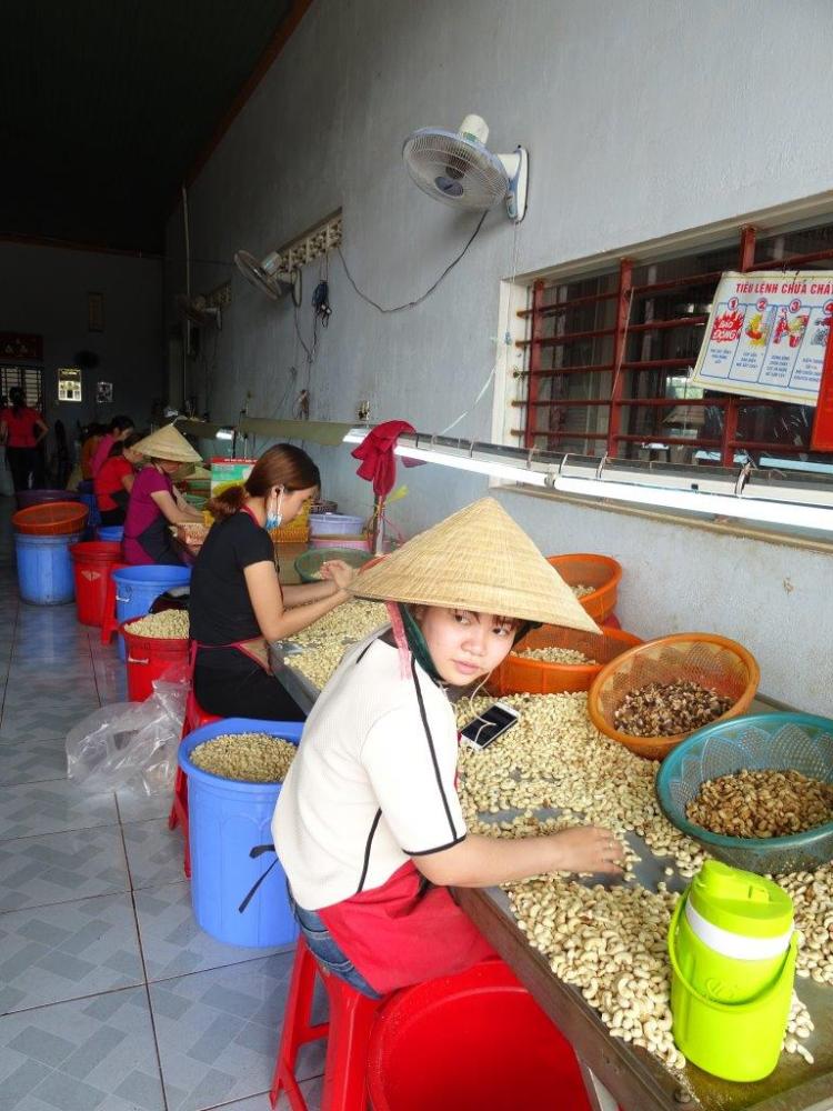 After lunch, which The Newby wolfed down (he is very much better), we hit the road again stopping next to look at cashew trees. They are big trees. When the nuts are ready they fall to the ground and are harvested manually. The whole process from harvest to ready to eat is also done manually. We stopped at a processing place and saw it. The extrication of the nut from the poisonous shell with a sharp knife, the roasting in a wood fuelled oven, the rolling to remove the acidic skin, the sorting and the bagging. Yummo! Had to buy a kilo. At 250000 dong ($15/kg) it was a great bargain and they taste great with bia (beer).