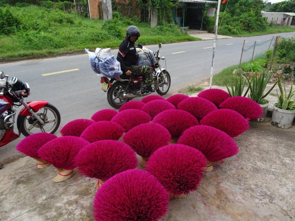 On our way to the next stop I saw 2 men let 2 roosters loose on each other. This sport is banned most places in the world but this is Vietnam. We keep hearing that we are seeing the real Vietnam. “You wouldn’t see that on a bus tour”. After a boat ride across the river, we passed an incense making company. The incense is sold to buddhists to burn as an offering. The bundles of sticks drying by the side of the road looked so pretty. The photo shows you what I mean about how the space between the house and the road is used.