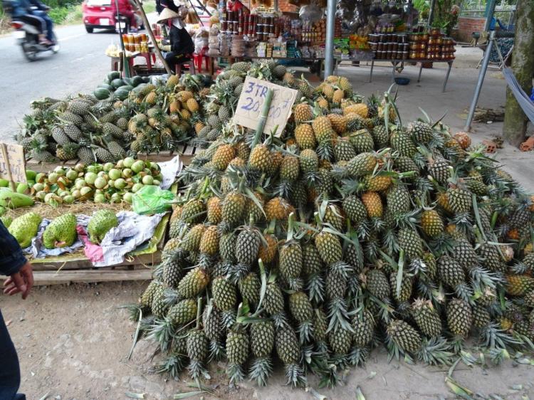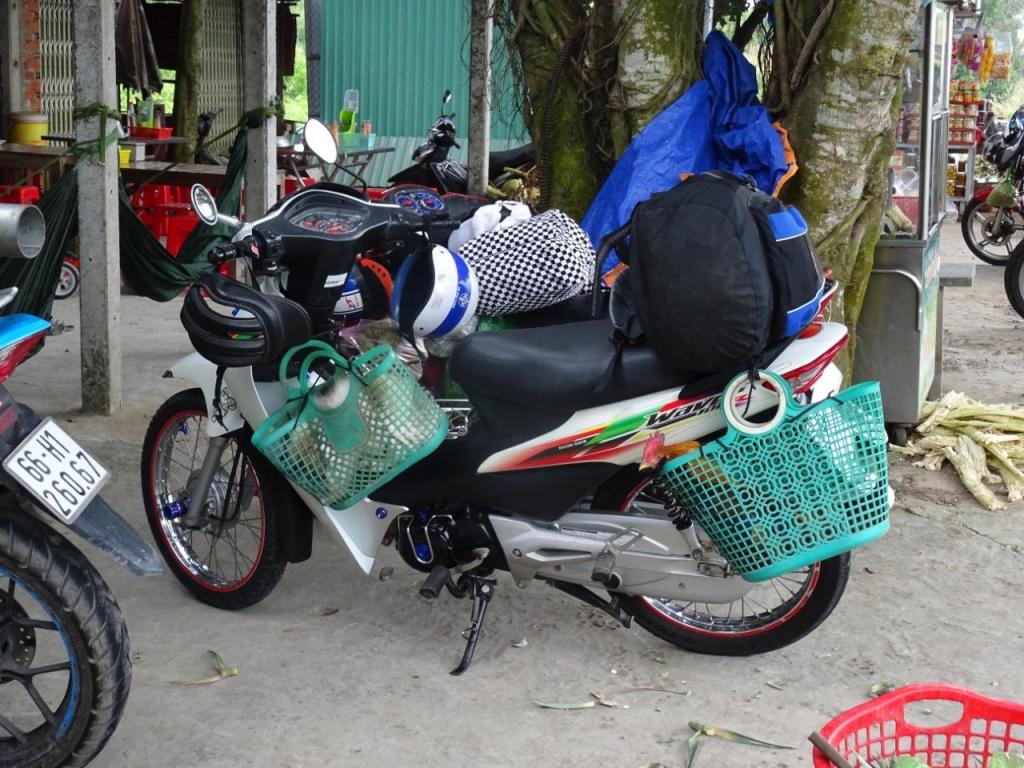 Part way along the road we stopped for a break of pineapple, green mango and other Vietnamese delights. A bit further along we stopped at a fresh food stall. Once across the road (no mean feat) we could choose from snakes caught in traps in the river (120000 dong / kg) or rats freshly caught in the rice fields (from 80000+ dong/kg depending on their size). For a fee, we could have our selection killed and prepared for eating. The rat is fried with lemon grass. Who knew? Right as we were considering which to purchase, a scooter slid onto its side right where we were standing. It unfolded in front of me, behind The Newby and Sunny. I grabbed their arms to yank them out of the way. Fortunately only one other scooter went down, but it had the potential to be a pile up. No one was injured, including us, although the man was shaken. A sobering incident and I am pleased no kids were involved as many families, all piled onto one scooter, were on that road. The parents do things we wouldn’t get away with, like ride with helmets while their kids don’t have them or stand the kids on the bike seat between them. I even saw one woman driving a scooter while supporting a baby sleeping between her and the handle bars. I hope St Christopher is watching over them.