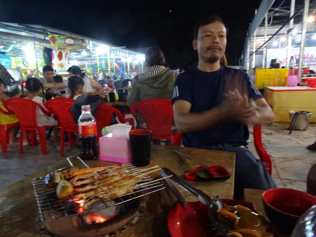 We are now in a nice hotel, having just had dinner and a walk. Sunny and Tuan took us to dinner on the bikes. We had a really good and very authentic meal in a cafe style place. The floor was filthy with salad leaves and spent serviettes but with good reason. The meal was a plate of leaves, some rice paper, a few bbq’ed beef cigars and some fried pancakes. We rolled whatever ingredient we wanted into the rice paper or the leaves and tucked in. All for the grand total of $1.50 each! After dinner we chose to walk back to the hotel via the supermarket. Did I mention that there is NOTHING on trip advisor about this town. Foreigners do not ever, ever, ever come here. So we were the main attraction in the supermarket on the busiest night ever! And I still managed to choose the slowest checkout.