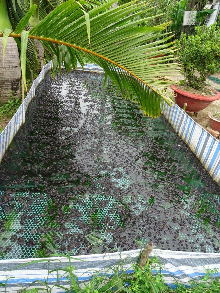 After a reasonable nights sleep and noodle with pork breakfast we set off on what I am going to call Flower Day. Our first stop though was a frog farm. Actually we stopped at a breeder who grows the frogs beyond tadpole size them sells them to a grower for 1000 to 2000 dong each. Fully grown they are worth about 40000 dong a kilo. He only breeders them because growing them needs different enclosures to make sure they don’t escape. We saw lots of frog farms so clearly there is a market for them. Most are eaten in Vietnam.