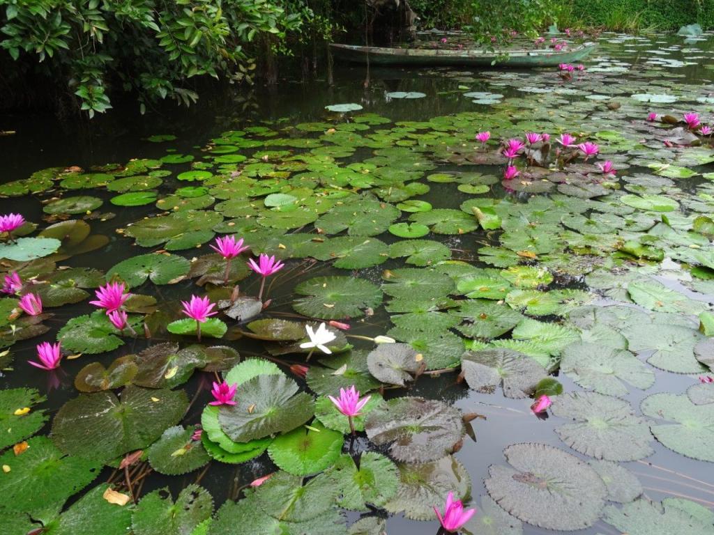 Our next stop, right as the rain started, was Xeo Quít. This is a place that was a training ground for national liberation front soldiers who were resisting the south and America. The communist party sent officers here to train locals so they could join the fight when the time came. The area was bombed in an attempt to disrupt their training. Every bit obviously helped to win the war (from the perspective of the communists). The site is now a tourist attraction, in the way that only the Vietnamese can do. No one was there. We were paddled around some narrow waterways, through a small parcel of jungle, before we watched some basket weaving being done by the ladies waiting to paddle the tourists. In this park there was a lovely lake with some beautiful lillies. I found out the way to tell lilies from lotus. The lily leaf rests on the water, while the lotus leaf grows above it. These were also the biggest lily pads ever. The frogs (if they weren’t being eaten) would love to sit on this pads.