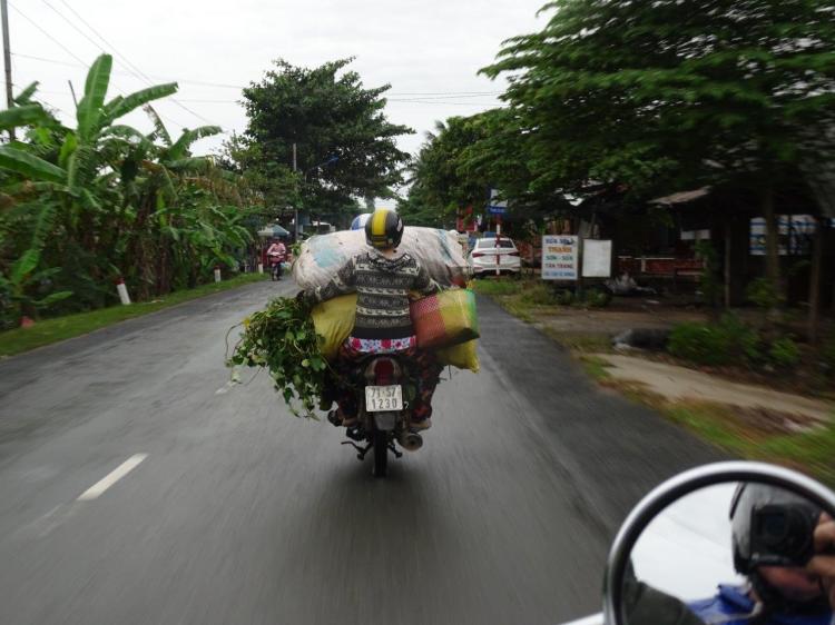 After lunch we started on our way to the Mekong Delta. Tuan warned us that the traffic might be bad thanks to the end of the holiday and people heading back to Saigon. Oh my word! Bad was an understatement. This traffic was just plain crazy. The single lane road (one in each direction) was flooded with scooters, buses, trucks and cars. All going in the opposite direction to us and many of them doing it on our side of the road! Far too many times, over a good couple of hours, we had bikes, trucks, buses, and cars coming straight for us. The weaving, revving, swerving, speeding and other antics were all happening to our left like a stupid cartoon, while to our right we were passing picture perfect rice fields, brilliantly green in the sun. I have to say that Tuan did an amazing job getting us through that chaos. I didn’t feel he was ever unsafe, stupid or risky and he was cool as a cucumber in the face of certain death. So I just sat there and watched it happen.