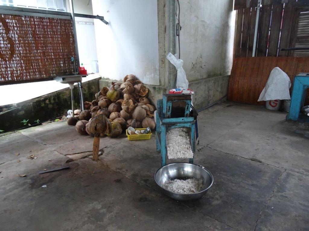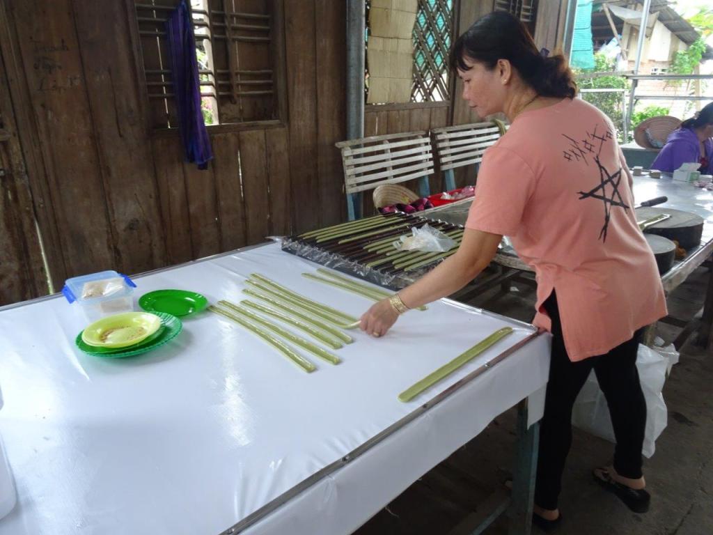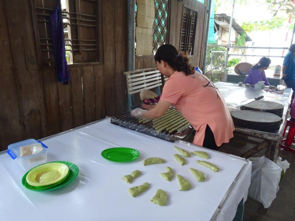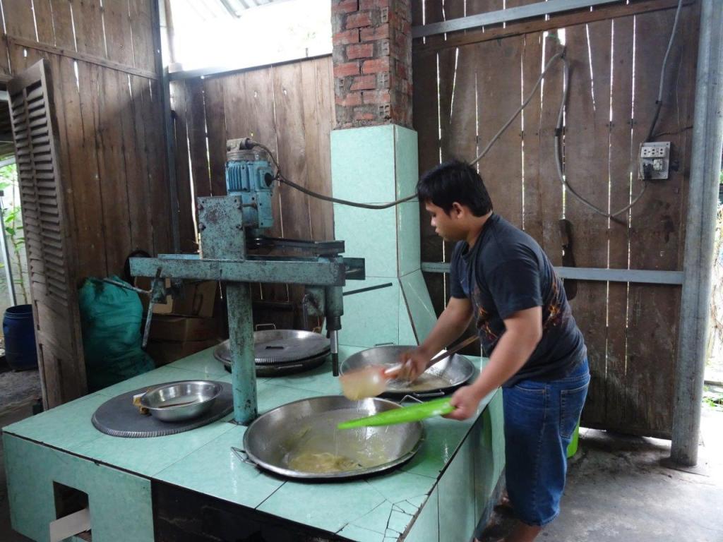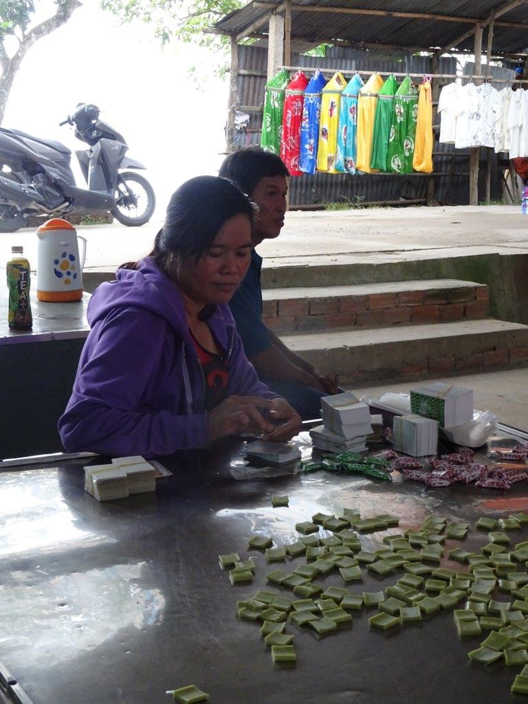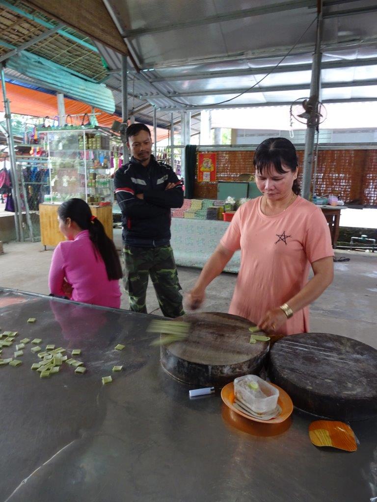 Thursday the 3rd January 2019 was our last day on the bikes. It started after a nice breaky by the pond. Thankfully the rain that fell overnight was gone by the time we got on the bikes. I’m going to call this day Food Day. Our first stop was a great coconut (dua) small business. We got to see how the coconuts are husked, shelled, macerated, pressed for their milk, cooked to toffee consistency, cooled, moulded, cut and wrapped. An amazing, labour intensive product created in a typical Vietnamese small business. We bought plain and chocolate flavour. Couldn’t resist. Every part of the coconut is used. The husk and shell fuel the fire that boils the toffee. They are also used to make other things like the mortar and pestle I bought. I’ve always wanted one for my kitchen and now I have one that will remind of this great holiday.