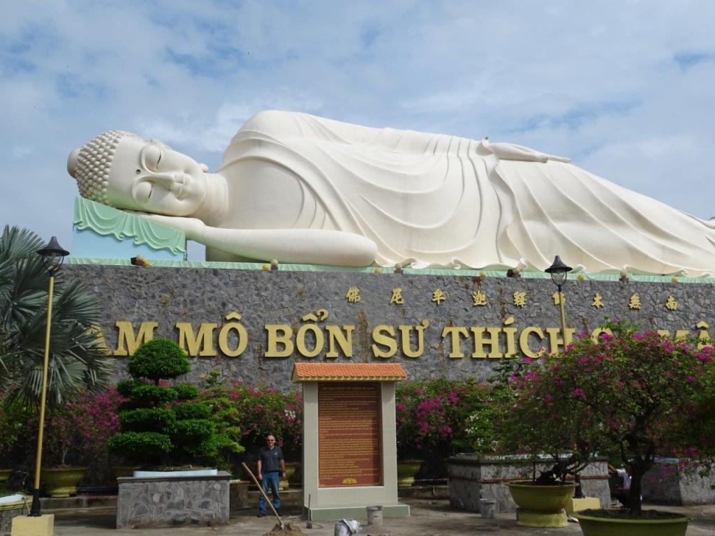 Back on the bike we crossed the river by bridge. The construction of this particular bridge, which is huge, saves over 2 hours on the commute to the Mekong food bowl. On the other side we visited a Pagoda with a huge sleeping lady Buddha and a huge fat, happy Buddha. I think we are all Pagoda’ed out although I do want to take my lucky can of red bull to the Cao Dai temple tomorrow. Cao Dai is a Vietnamese religion that recognises all faiths, believing that God is represented by the Christian god, Allah, Buddha, Elvis or whomever you like. The eye of Cao Dai is watching us all. I like this idea, so we plan to visit a Cao Dai temple on Saturday.
