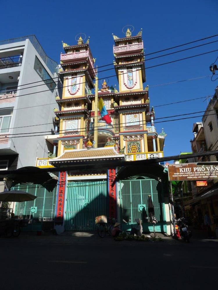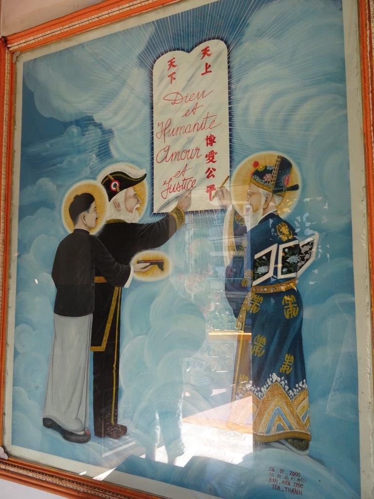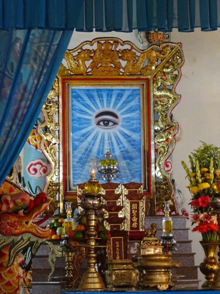 Detecting is hard and hot work, so having solved the crime we needed food before walking miles around Saigon to drop off The Newby’s phone to have the screen repaired. On the way we went via the Cao Dai temple. Cao Dai is a Vietnamese religion that accommodates almost all religions into one. If you look at my photos you’ll see Buddha, Confucius, Jesus Christ and elements of Islam in the shapes. The temple was closed when we arrived. Our main mission here was to leave the can of red bull. As I sat in the gutter on the other side of the road, a lady came out the gate so we approached her to see if the temple was open. She let us in and then another lady gave us a guided tour and a lesson on Cao Daism. The Godfather (which I interpret to be God the Father) is the important element, followed by the eye. Always the left one as it is on the same side as the heart. Colour is a huge feature of the temple. It felt really nice to be there and I left the lucky can of red bull for someone else to use as they need.