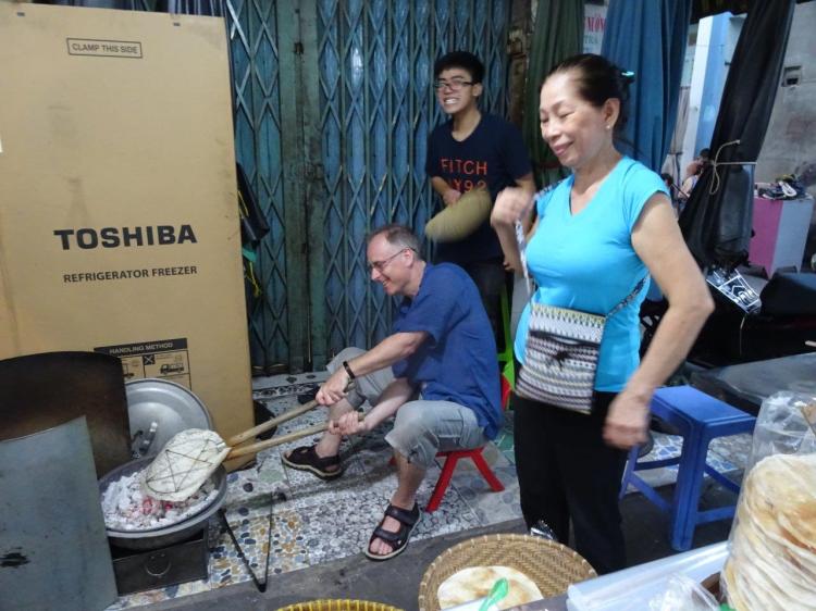Back home, via Grab, we enjoyed a short rest before our next tour. This one came up as an option through Airbnb, to spend 3 hrs scooting around Saigon with students. Bang on 5pm John and Fu were out the front of the apartments ready to take us for some street food. Our first stop was the Cambodian market in the heart of district 3. The lovely lady let The Newby and I cook rice paper crackers on the coals, while Fu fanned us! We did an alright job, but we wouldn’t make any money at the rate we went. Our next wander was through a flower market where we learned the importance of flowers for funerals, Valentine’s Day and other occasions. Fu bought The Newby a single red rose to give to me and thought he was the ducks guts (which he was).